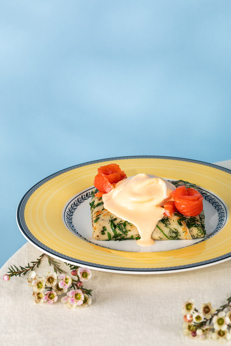 Вариант для любителей яиц бенедикт — блин в виде конверта со шпинатом, слабосоленым лососем и яйцом пашот под голландским соусом.