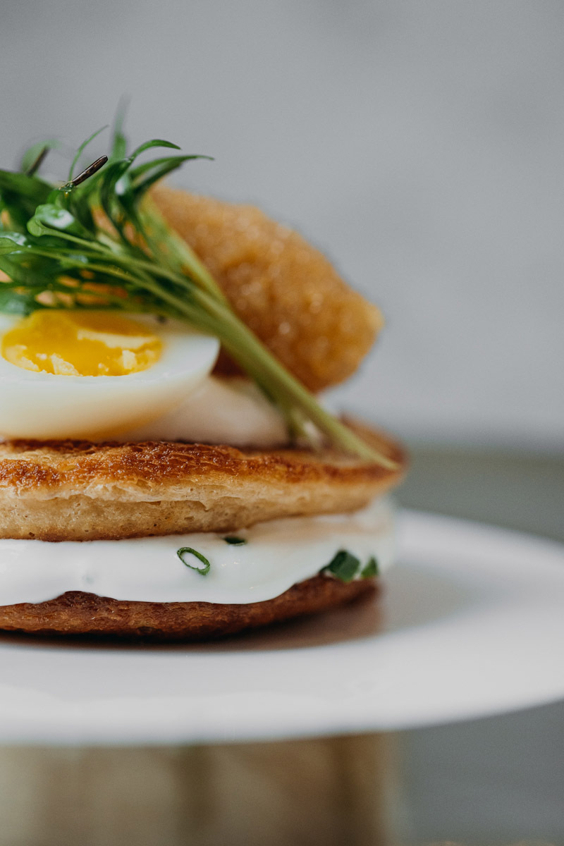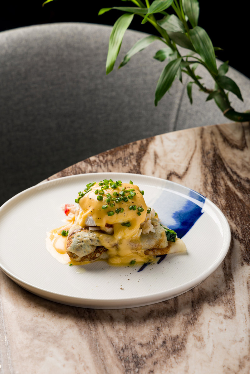 Этот блин успешно притворился «Бенедиктом» с крабом — яйцо пашот, голландский соус и россыпь шнитт-лука ему «к лицу».