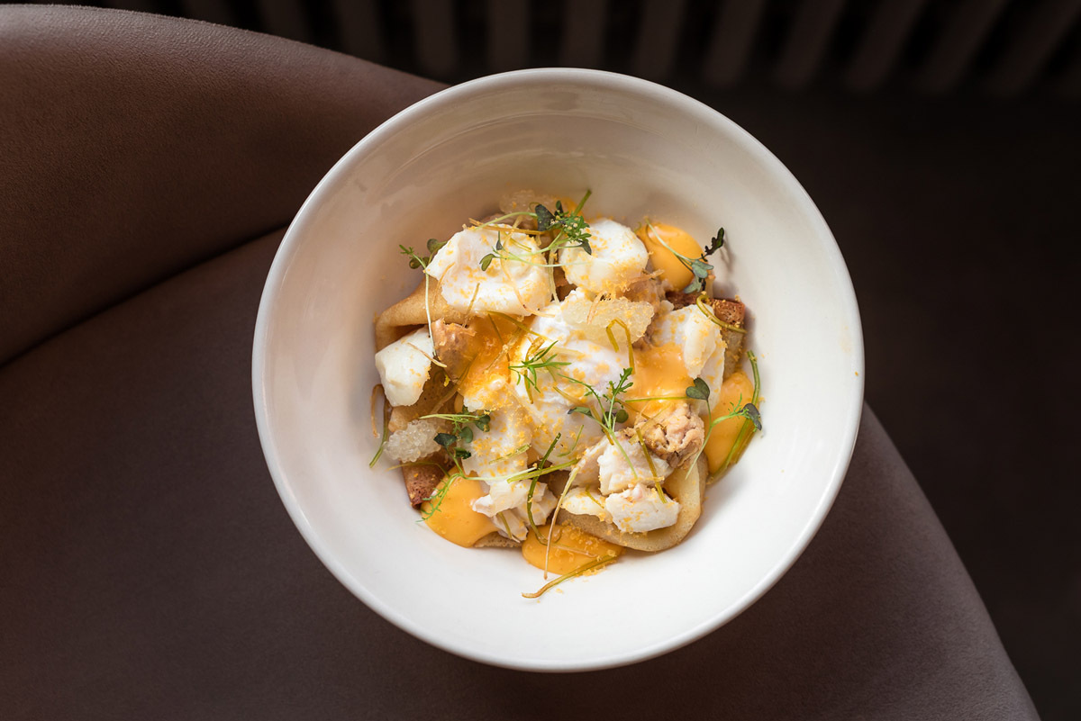 Что: Блины с крабом и яйцом пашот под голландским соусом