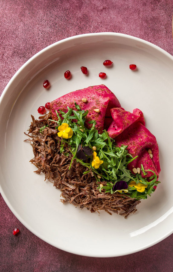 Александр Мандрон, шеф-повар ресторана, добавляет в тесто фруктовые фреши — отсюда у блинов и рубиновый цвет, и новое вкусовое сочетание.