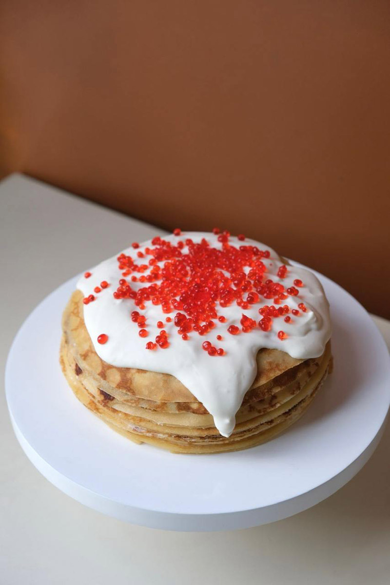 Блинный торт от шеф-кондитера Павла Ивановского привозят в Coffee Buro из кондитерской Cake Me, где блины пекутся из микса классической и миндальной муки. Под видом красной икры — желе из сахарного сиропа.