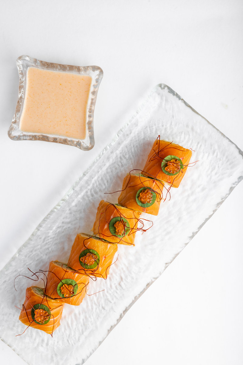 Что: Блинный ролл с лососем, сливочным сыром, икрой форели и соусом кимчи