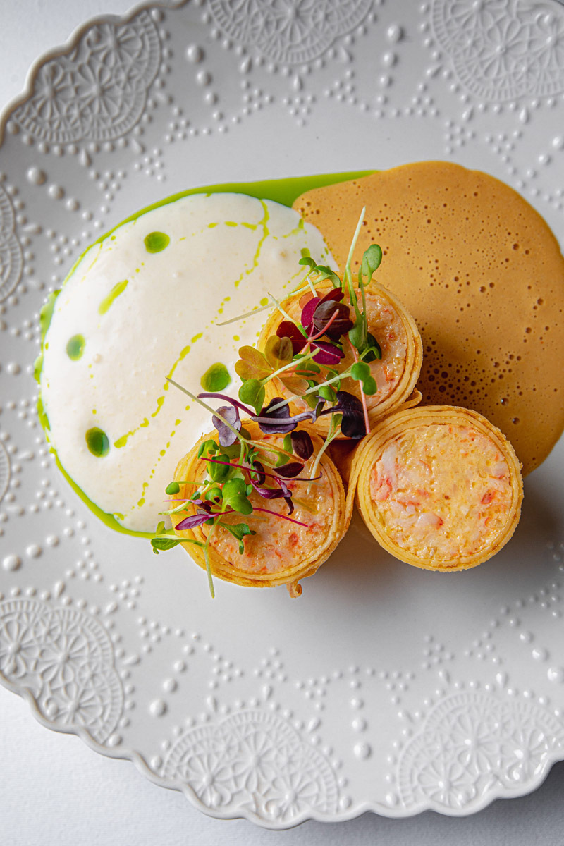 Блины бренд-шеф Денис Крупеня запекает в хоспере — смеси гриля и печи, — поэтому такие румяные, а подает с сочным крабом и пряным апельсиново-имбирным соусом.