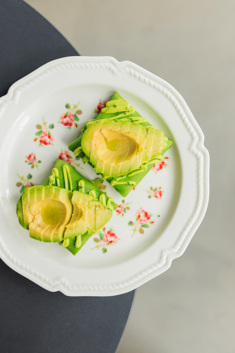 Блины, к которым смело можно добавить приставку «кето», — они зеленые (цвет придает шпинат), внутри целое авокадо и крем из свежего укропа.