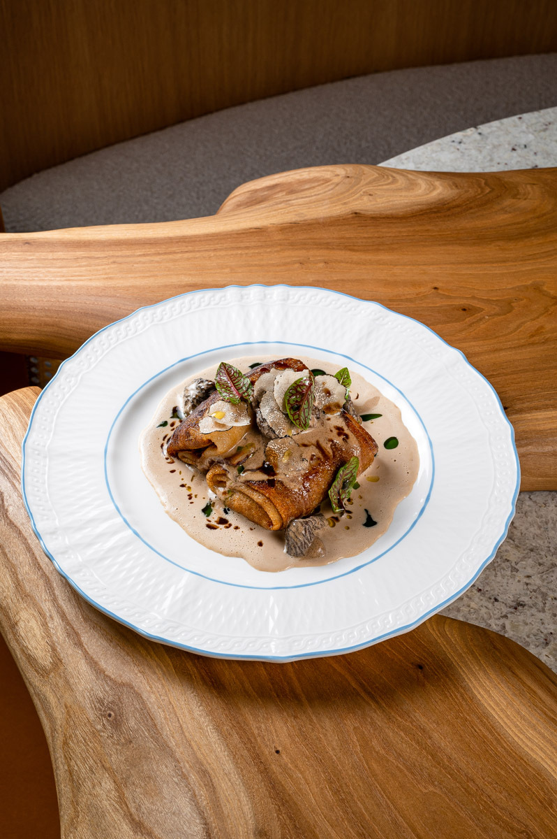 Бренд-шеф Егор Макаров в Buro Bistro умело превращает блины не только в роллы и пирожное тирамису, но и в голубцы — с цыпленком и трюфелем и соусом из сморчков.