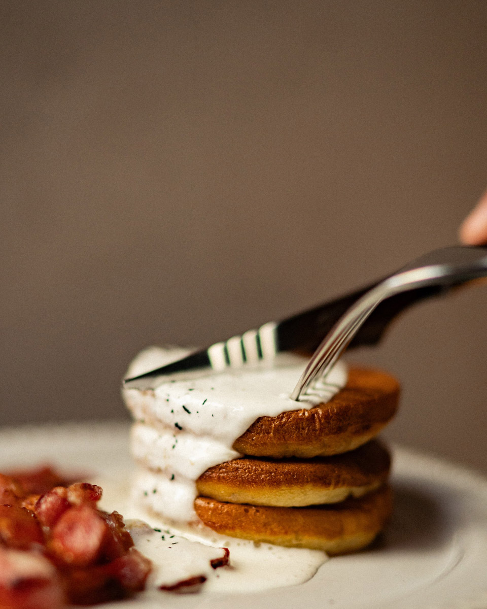 Если устали от классических тонких блинов, забегайте в Tilda на воздушные панкейки, утопающие в пармезановой пене.