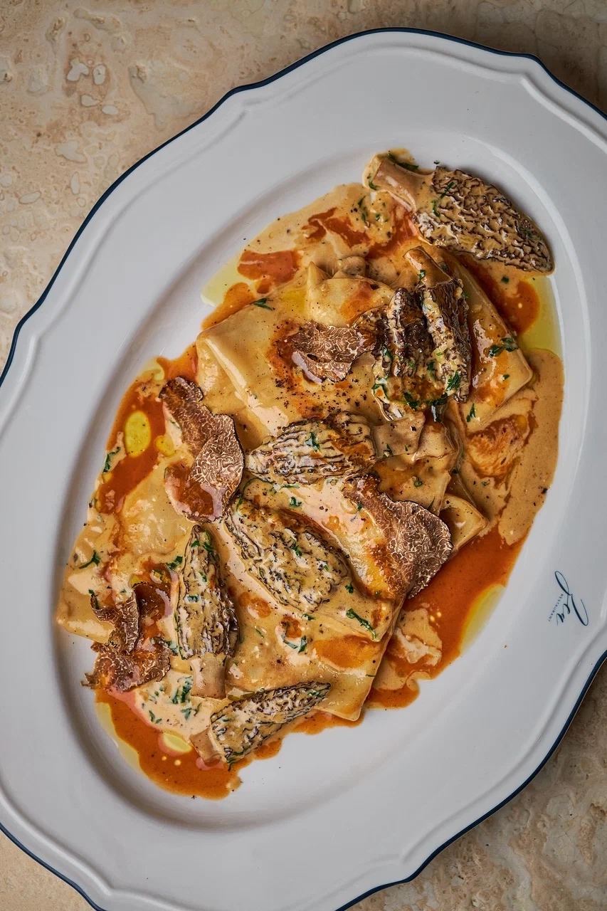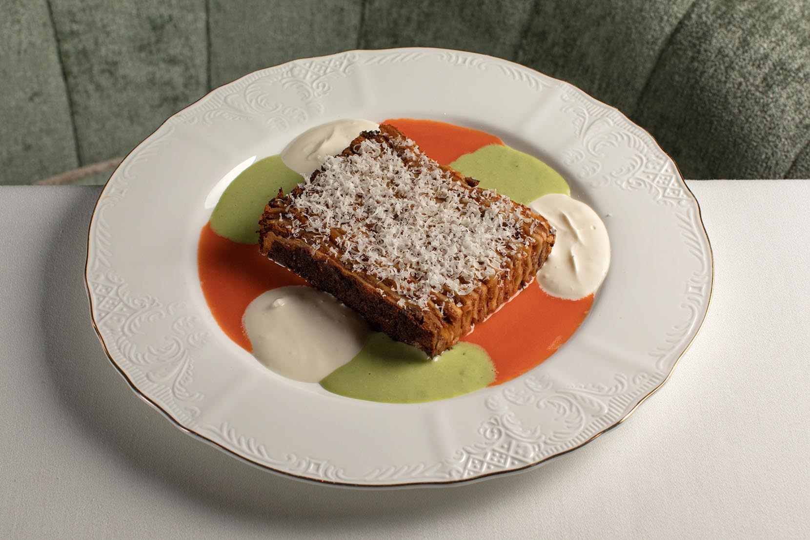 Шеф Иван Кузнецов в Unica готовит русские блины с итальянским акцентом — в виде мясной лазаньи в классическом томатном и базиликовом соусах, сметане с моцареллой и выдержанным пармезаном.