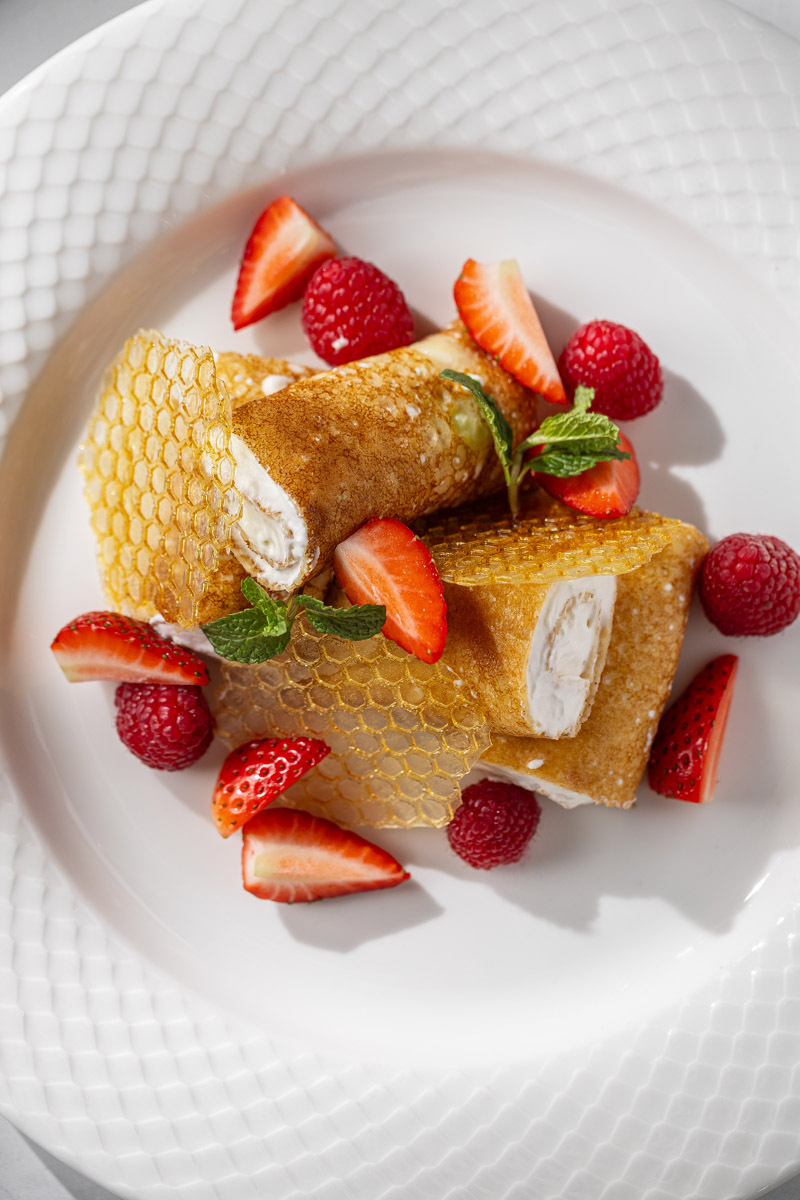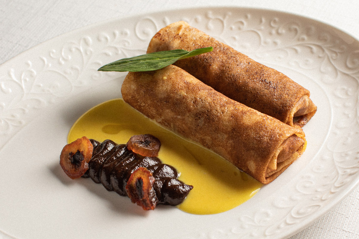 Шеф-кондитер Бек Караев добавил десертным блинам азиатскую нотку — искупал с муссе из темного шоколада и украсил сочными мандаринами. Запивать предлагают зеленым лунцзином, медовым улуном или листовым чаем да хун пао.