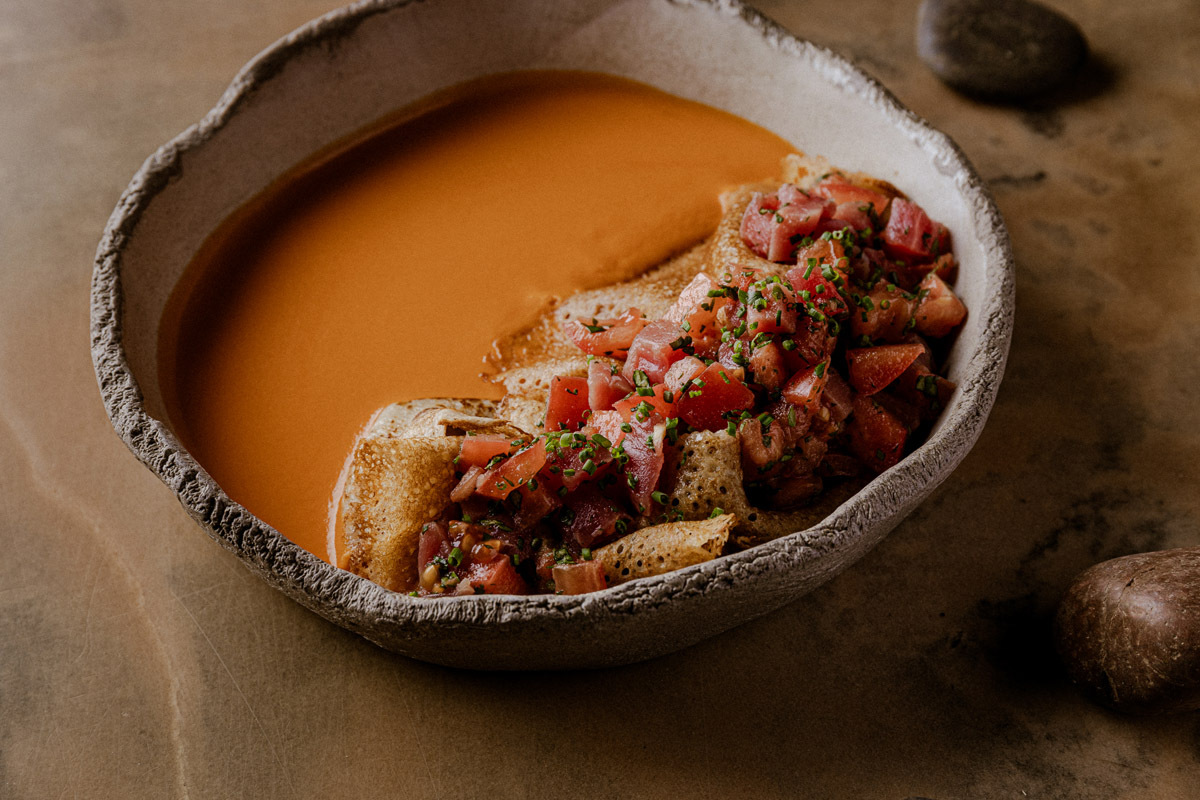Что: Блины с соусом ромеско из печеных перцев, тунцом и томатом