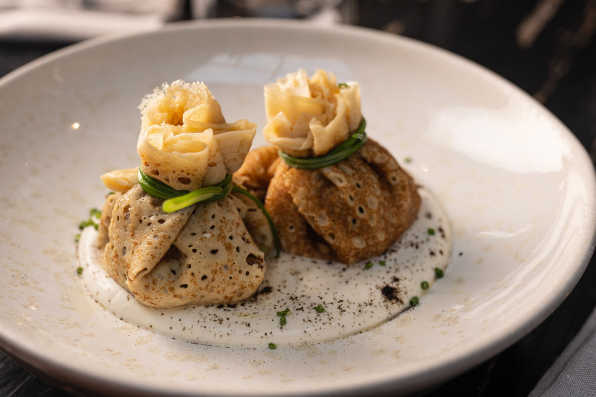 Сытные блины с грибами — авторская позиция в масленичном меню от концепт-шефа Азиза Саффара для вегетарианцев. Есть и для мясоедов — с телячьими щечками.