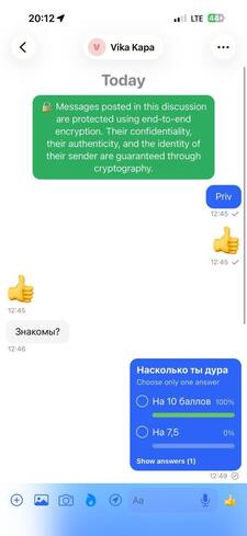 Интерфейс мессенджера довольно примитивен — выглядит буквально как iMessage. Никаких интересных плюшек, разве что можно устраивать голосования (в «телеге» это можно делать только в групповых чатах либо в каналах), но едва ли функцию можно назвать необходимой. Фотки/видео/голосовые — все по стандарту. Заходить в свой аккаунт с нескольких устройств — только при платной подписке (349 рублей/месяц на одного и 499 рублей — семейная). Выполнять аудиозвонки и видеозвонки тоже за деньги, принимать звонки — бесплатно. К качеству связи вопросов нет, мессенджер работает без VPN. Но в местах, где стандартно «глушат» мобильную связь, работать не будет.