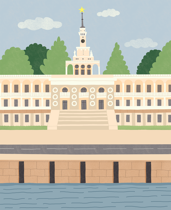 «Мангазея на Речном» расположена как раз рядом с таким важным архитектурным лендмарком: Северным речным вокзалом — шедевром сталинского ампира, вдохновленным венецианскими палаццо и Дворцом дожей. Этот символ эпохи с изящными скульптурами, майоликой, панно и шпилем, увенчанным звездой из уральских самоцветов, был не просто транспортным узлом, а первым в СССР масштабным общественным пространством.
