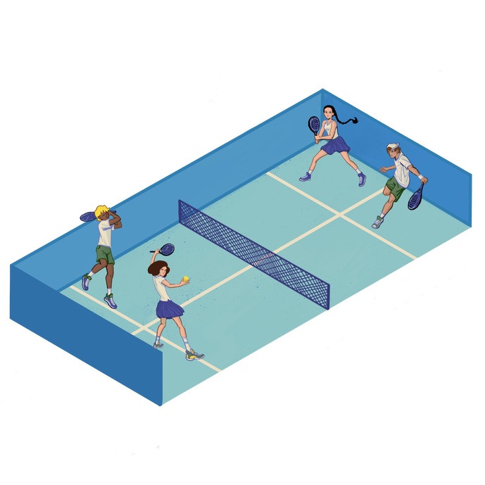 Теннис разворачивается на просторных, залитых солнцем кортах — чаще всего это трава или грунт. Игроки, стоя друг напротив друга, соревнуются в парах или индивидуально, стремясь к победе в сете.