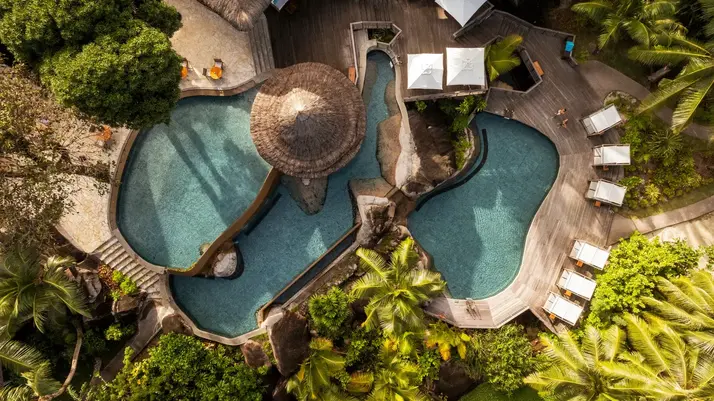 В отеле приятная спа-программа (балийка Рая, например, с радостью уничтожит ваши лопатки, если попросите, а потом завернет в шелковое одеяло, чтобы вы отлетели в космос под глюкофон), есть йога-зал на крыше и прозрачные каяки на, как правило, небольших пустынных пляжах (обычно все гости загорают у себя на виллах) — отплываете и в полной тишине созерцаете как будто бы необитаемый остров. Ну а если вы с детьми, их непременно подхватит детский клуб и развлечет кулинарными классами, бердвотчингом и прогулками с морским биологом.