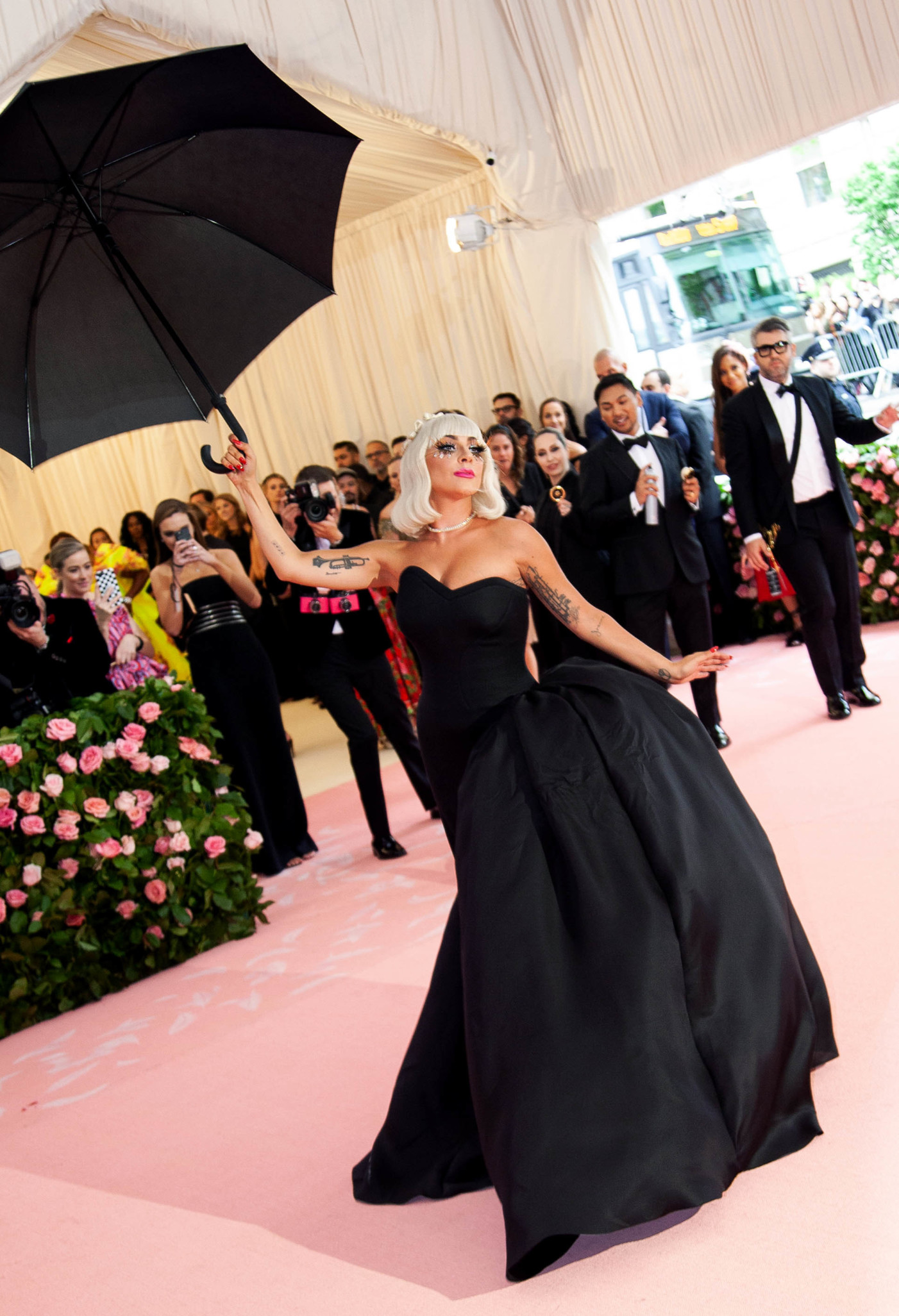 Леди Гага стала сопредседательницей этого MET Gala. Поэтому певица масштабно подошла к отражению эстетики кэмпа к своем наряде – она успела сменить 4 образа, проходя по красной дорожке. Леди Гага прибыла в пышном ярко-розовом платье, которое оказалось врехней накидкой – под ним находилось пышное черное. Затем она сняла черное, под которым оказалось ярко-розовое платье-футляр. Наконец, Гага избавилась и от него, оставшись в покрытом стразами комплекте белья и сетчатых колготках. Все наряды – Brandon Maxwell.