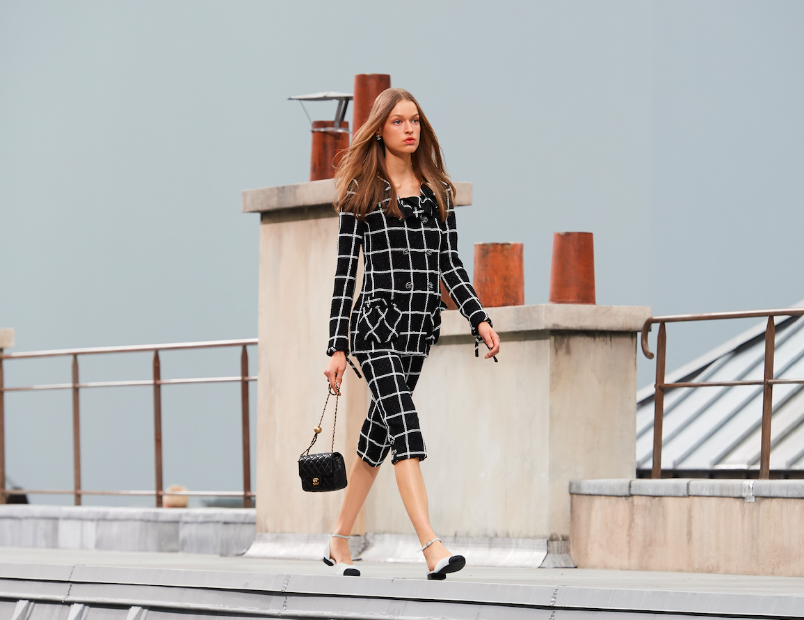 В Grand Palais прошел показ Chanel. В этот раз для шоу организаторы построили декорации в виде парижских крыш. Креативный директор бренда Виржини Виар впервые работала над линией Ready-to-Wear самостоятельно после ухода из жизни Карла Лагерфельда, который возглавлял Chanel с 1983 года. Дизайнер решила посвятить коллекцию Парижу. В палитре она использована серый, черный, красный, синий, белый, розовый и голубой цвета. Модели демонстрировали твидовые костюмы и укороченные комбинезоны, жакеты, платья в пол и прозрачные блузы с рукавами-фонариками. Вещи украшали принты в виде клетки, горизонтальных и вертикальных полос, графичных абстракций с логотипом Chanel и крупными цветами.