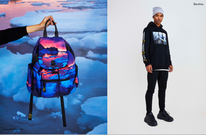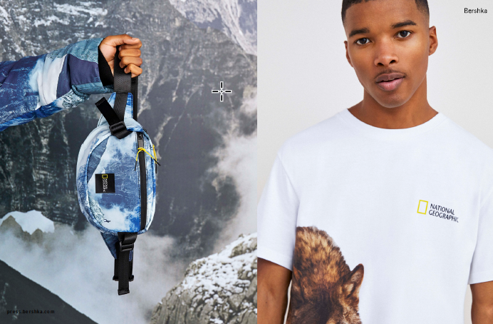 Bershka и National Geographic разработали совместную коллекцию из экоматериалов Join Life: переработанного полиэстера или хлопка. В нее вошли вещи с изображением пейзажей, арктического волка и красной панды: пуховики, худи, футболки, свитеры с круглым вырезом. Помимо этого, Bershka и National Geographic представили сумки через плечо, рюкзаки и поясные сумки.