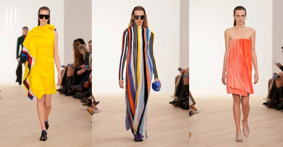 Особое внимание дизайнеры, конечно же, уделили материалам: кожаные жакеты и платья, созданные будто из резиновых материалов, мятые топы и платья, которые, кажется, окунули в вязкую жидкость и зафиксировали в этой форме. В этом считывается один из главных кодов Loewe — работа с ремесленностью и фактурами. В ироничных деталях (вроде платья-полотенца или похожих на пластик фактурах) увидели ненавязчивое продолжение дела Андерсона.