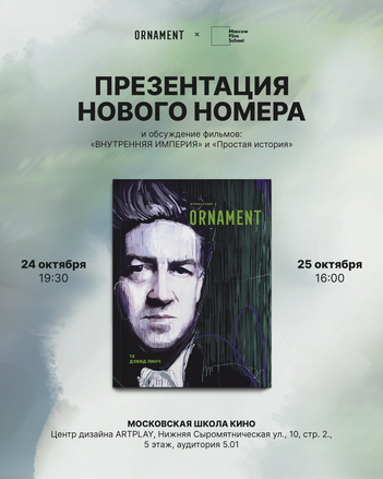 24 и 25 октября в Московской школе кино пройдет презентация нового выпуска иллюстрированного журнала Ornament. На этот раз команда издания посвятила номер американскому режиссеру Дэвиду Линчу.