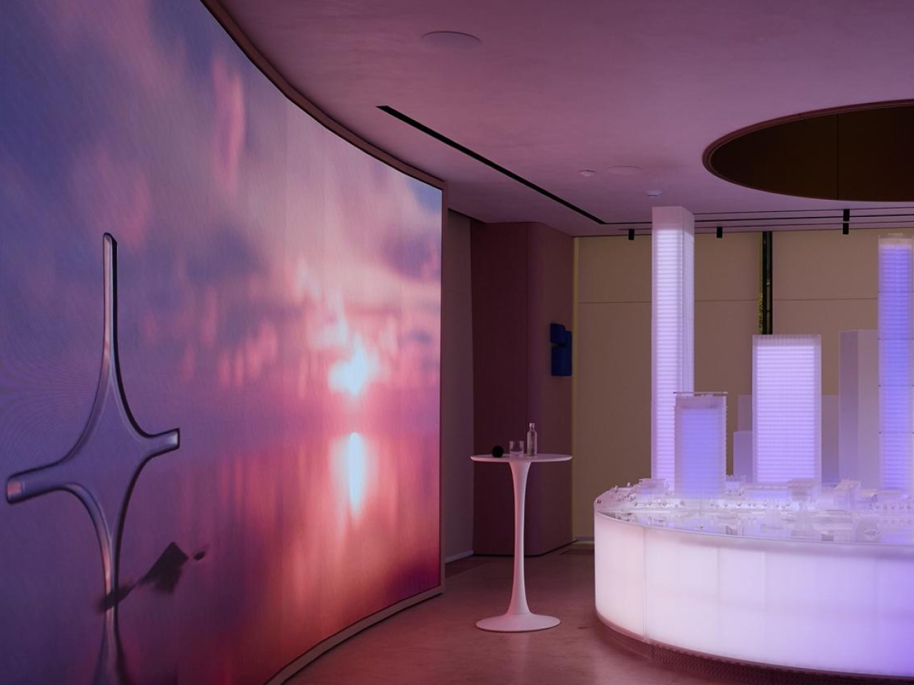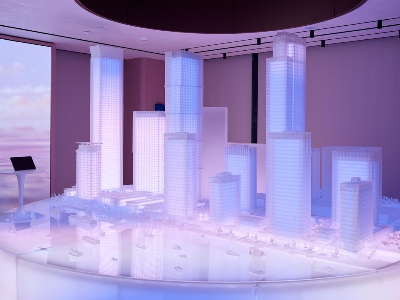 Главный «экспонат» офиса — интерактивный макет флагманского проекта «Северный Порт», созданный мастерской Studio 911. Освещение и звук управляются через интерактивное программное обеспечение TouchDesigner и реагируют на действия пользователя, превращая демонстрацию проекта в иммерсивный перформанс. С макетом синхронизирована внушительная медиастена площадью 18 кв. м, транслирующая визуальные сценарии с ASMR-звуковым сопровождением. Интерактивный макет и медиастена объединяются в единый сценарий и таким образом создают ощущение трехмерности и усиливают эмоциональное воздействие. Так, в зависимости от времени суток, генеративная подсветка медиастены видоизменяется, при этом каждый сценарий имеет свою цветовую схему и динамику.