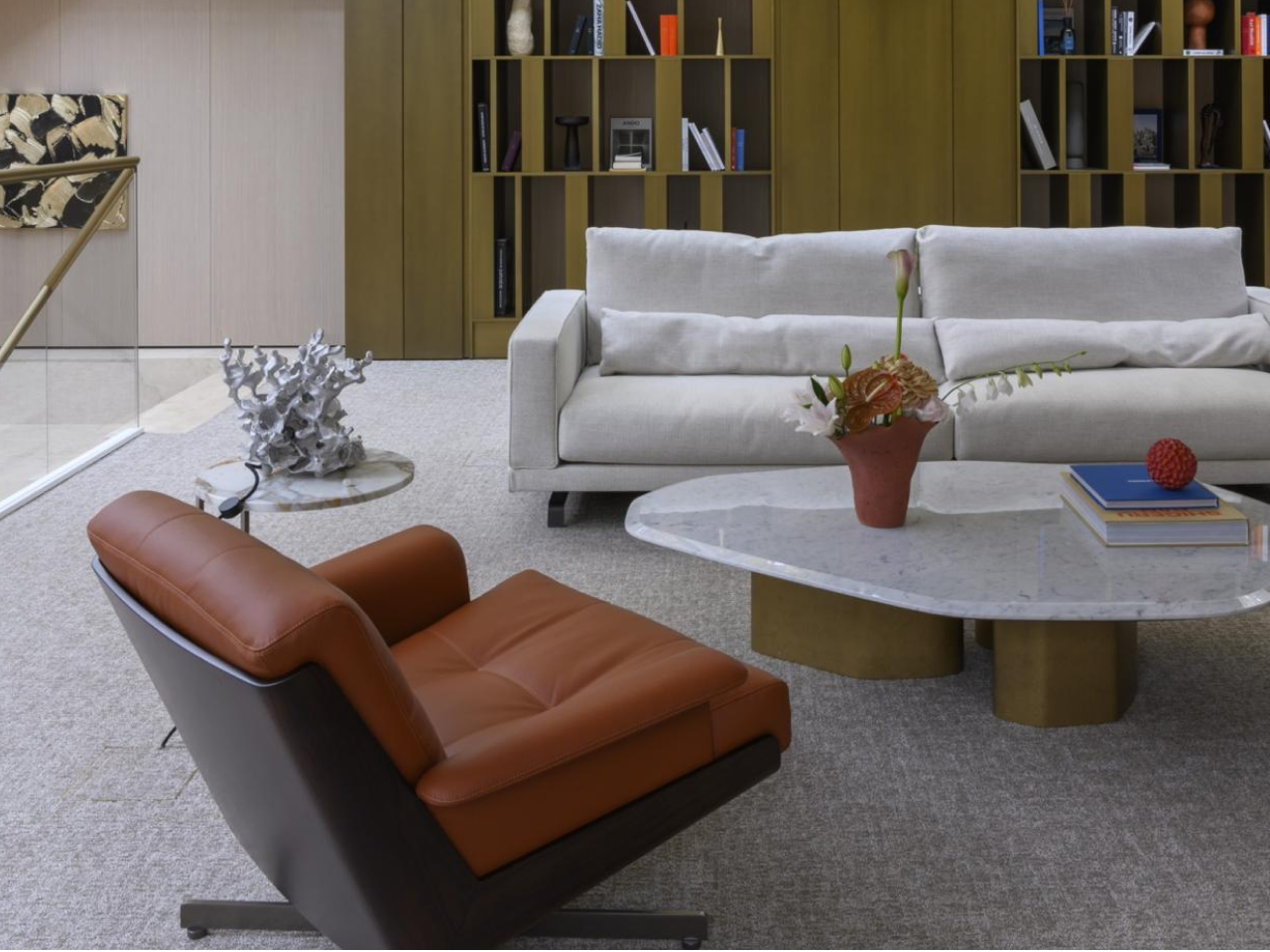 Двухуровневый офис оформлен бюро QuadroRoom и дизайнером Александрой Петуниной, известными проектами для исторических зданий и частных интерьеров. В пространстве сочетаются геометричные формы, натуральные материалы и мягкий свет, среди акцентов — латунь, мрамор и коллекционный арт. На первом этаже гостей встречает парадный ресепшен с мраморной стойкой и лаундж-зоной с библиотекой и авторскими коктейлями. На втором — переговорные и рабочие пространства команды LEGENDA.