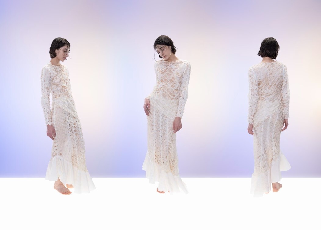 Дело происходило в лаборатории Шухов Лаб. Там же потом лазером кроили платье. На наш вопрос, как такую одежду носить и не бояться, что она развалится, Челбаева ответила, что уже восемь месяцев ежедневно пользуется кардхолдером из такого же материала и он отлично себя чувствует: