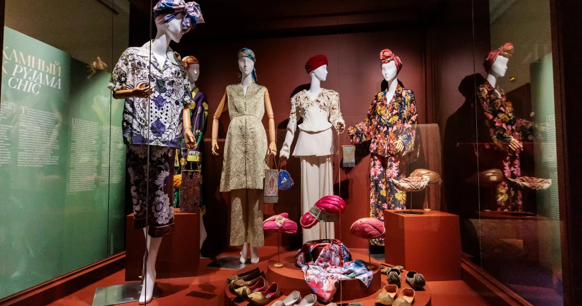 С историческими нарядами соседствуют работы российских модных домов (среди которых Alena Akhmadullina, Asya Malbershtein, Front х Gapanovich, The Nina Project & Arny Praht, Tegin Fashion House), а также вещи из личных коллекций Назима Мустафаева, Ольги Самодумовой и музея-галереи Purseum.