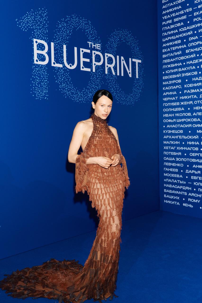 «Платье Кати выполнено из полупрозрачной сетки и плиссированного шифона, формирующего сложную, живописную фактуру. Поверхность создавалась из модулей: мелкие прямоугольные элементы разной величины вручную нашивались на основу, образуя градиент», — рассказал дизайнер The Blueprint.