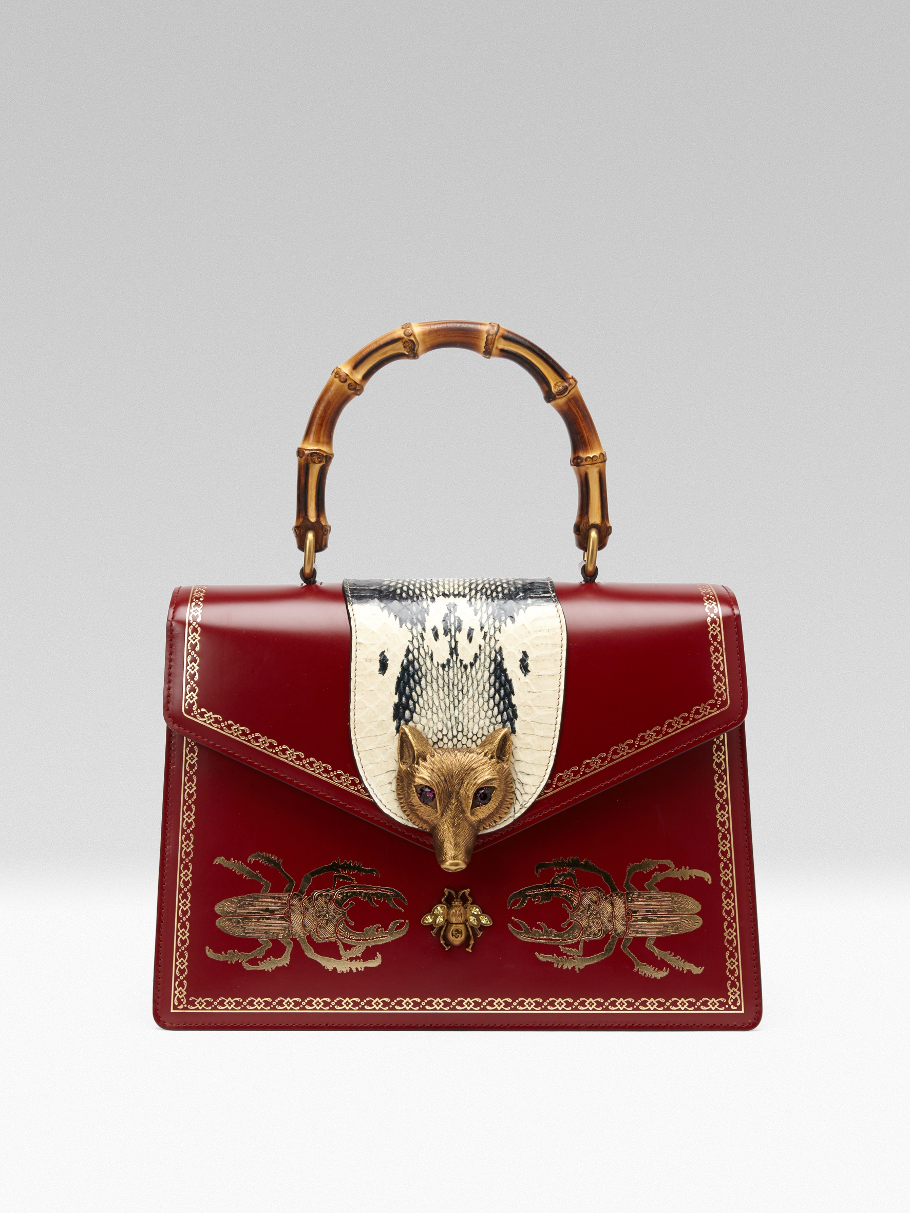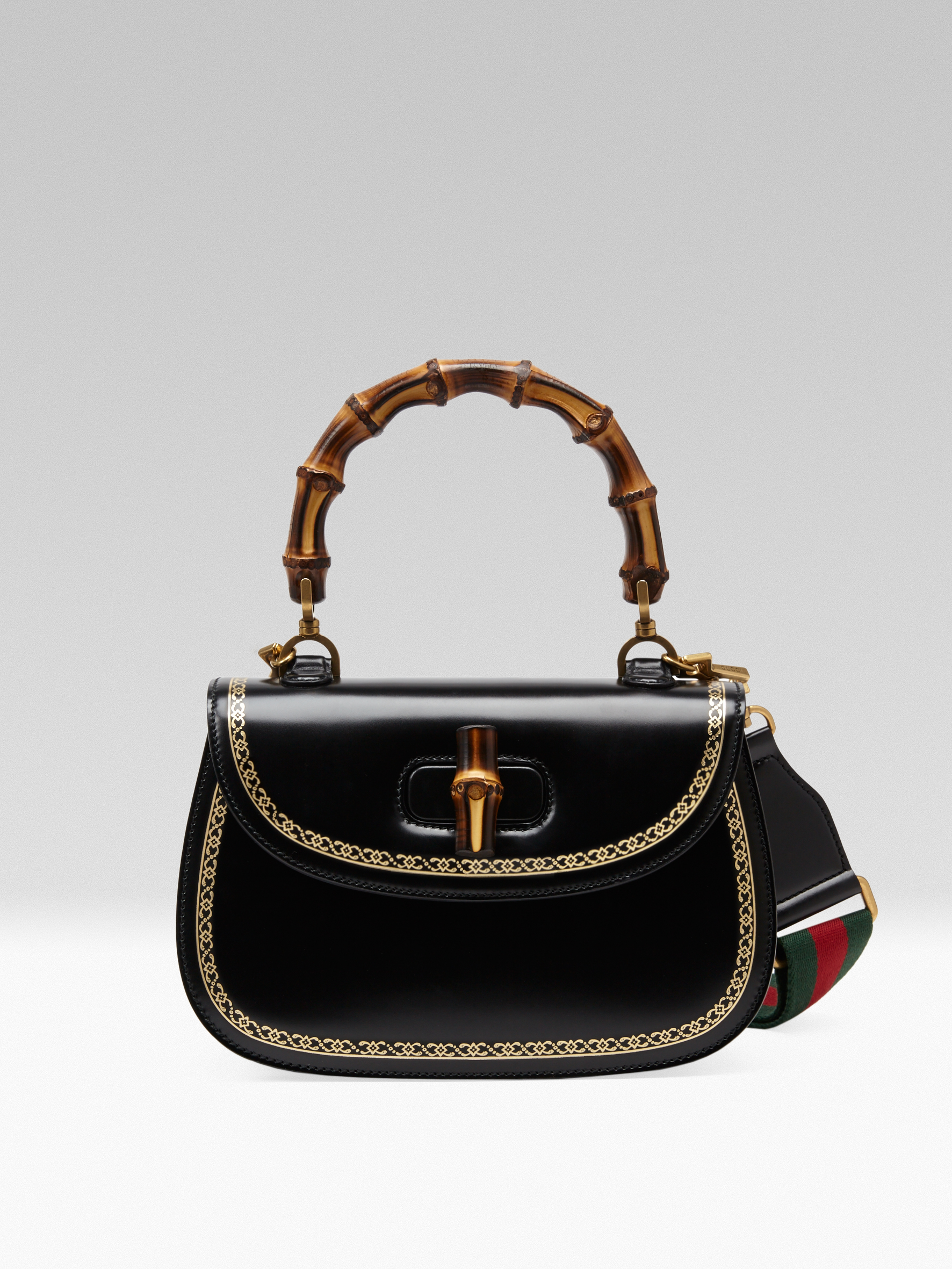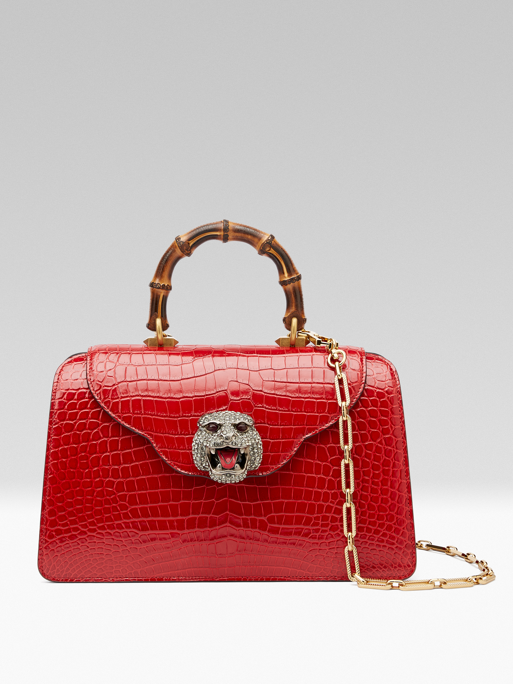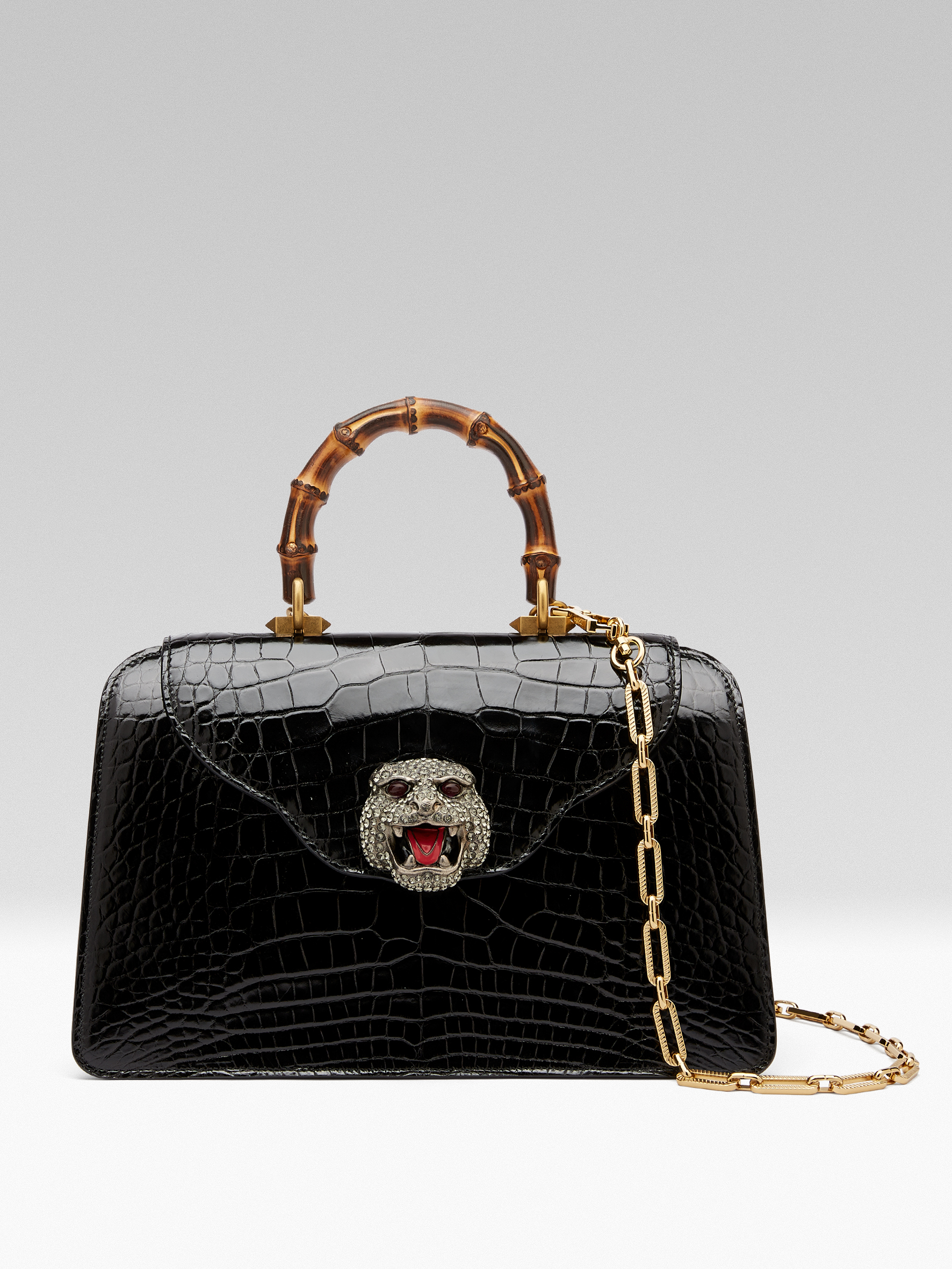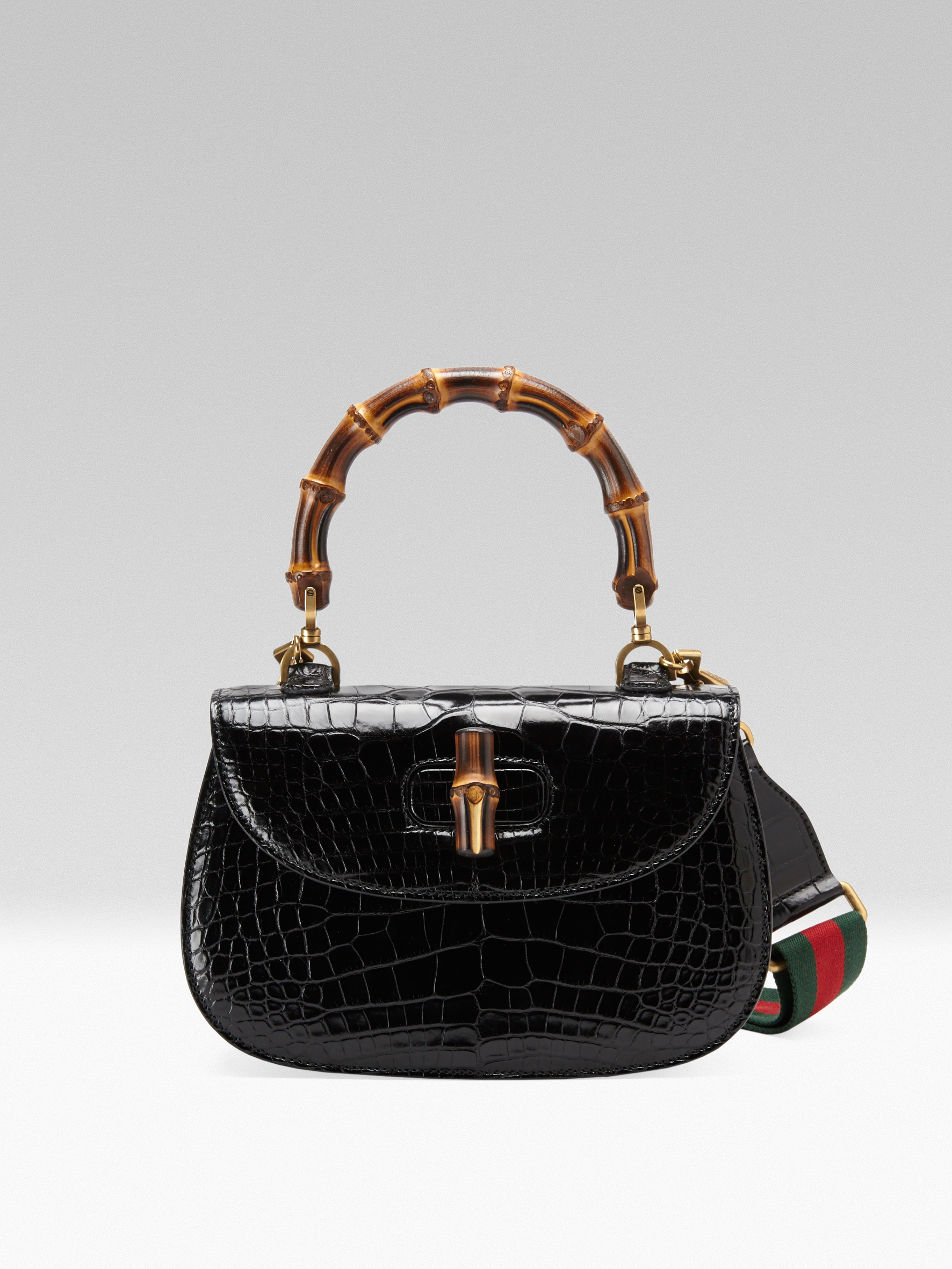 Gucci выпустили новую коллекцию сумок с бамбуковой ручкой Bamboo – в этом году модель отмечает 70-летний юбилей. Классическая сумка доступна в красном, белом и черном цветах. Gucci также использовали редкие материалы: кожу крокодила и страуса. Помимо классической модели в коллекцию вошли три новых сумки Bamboo: со съемными ремешками и цепочками, украшенные металлическими бабочками, тиграми и лисами и вставками из змеиной кожи. В подарок к каждой сумке идет книга Джейн Остин «Ювенилия» обложке с цветочным принтом.