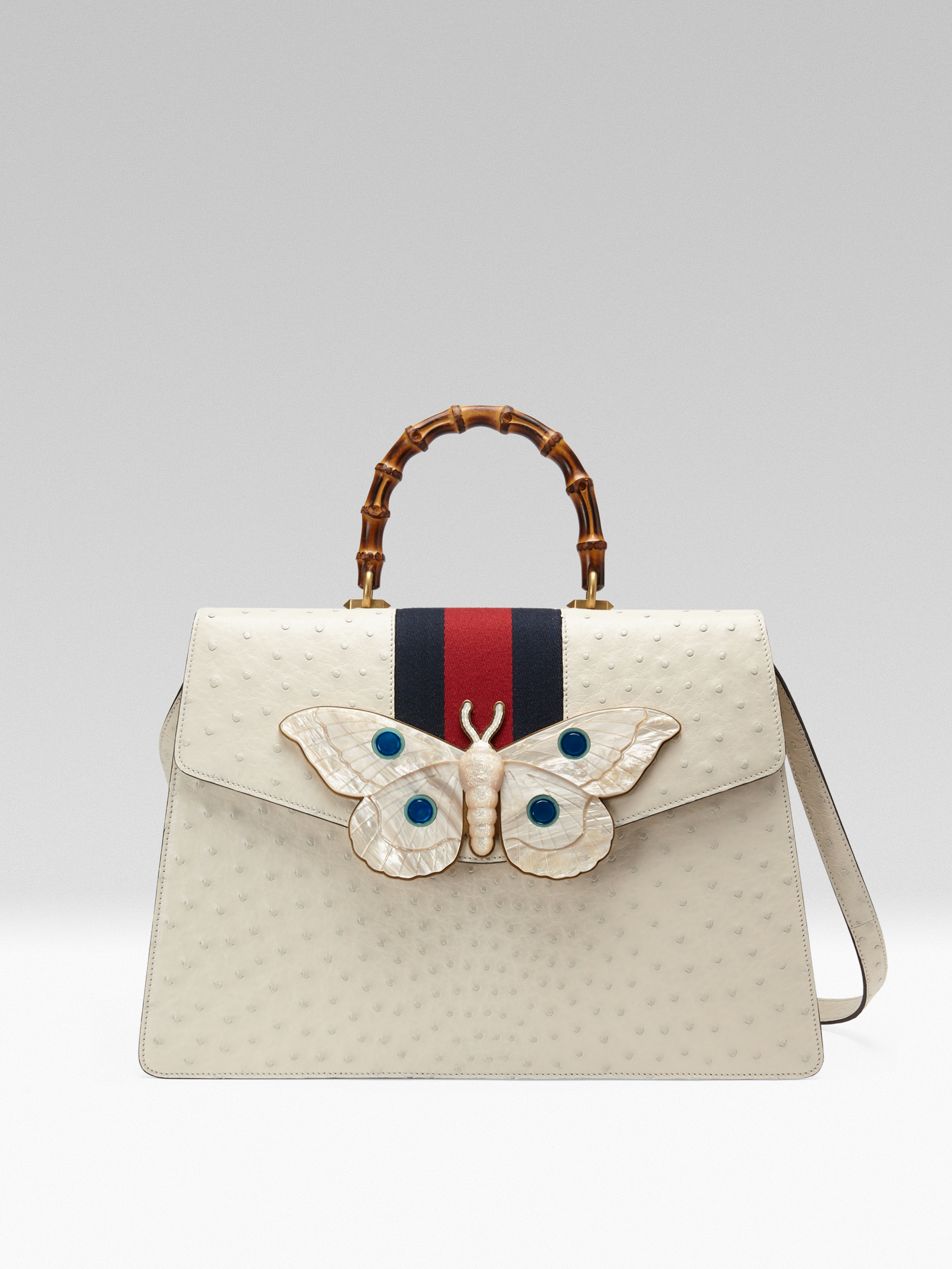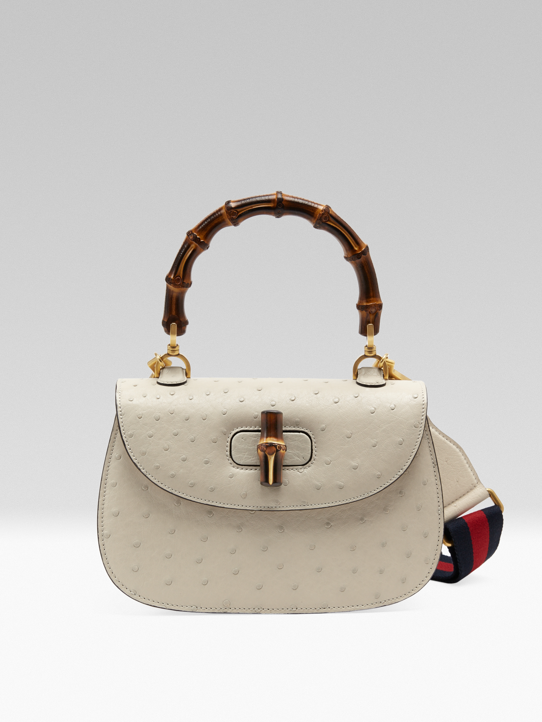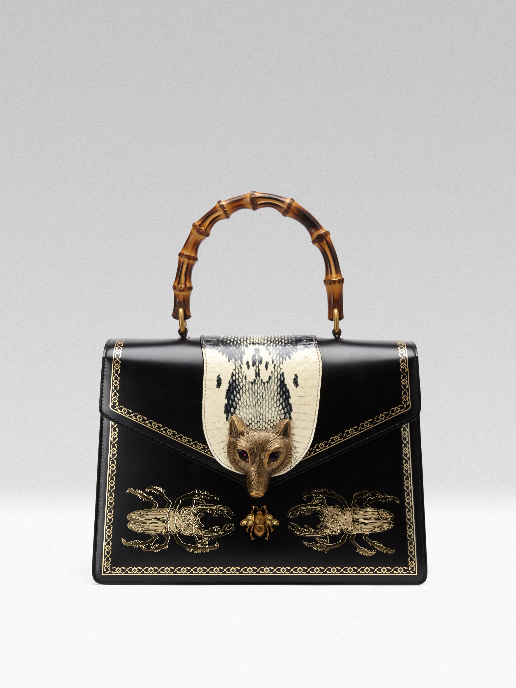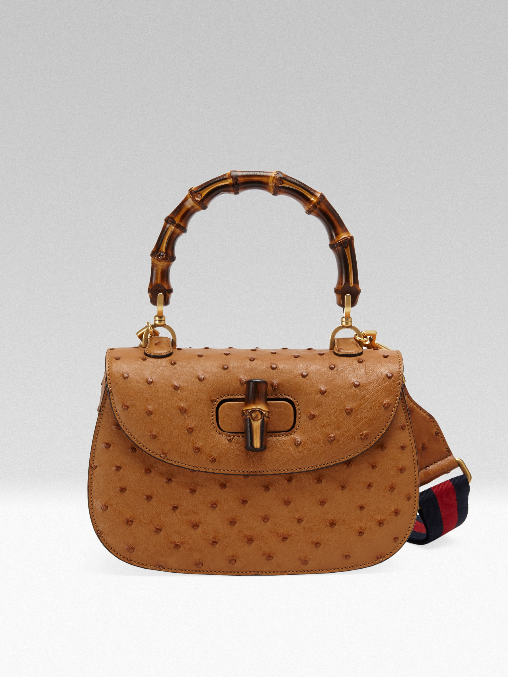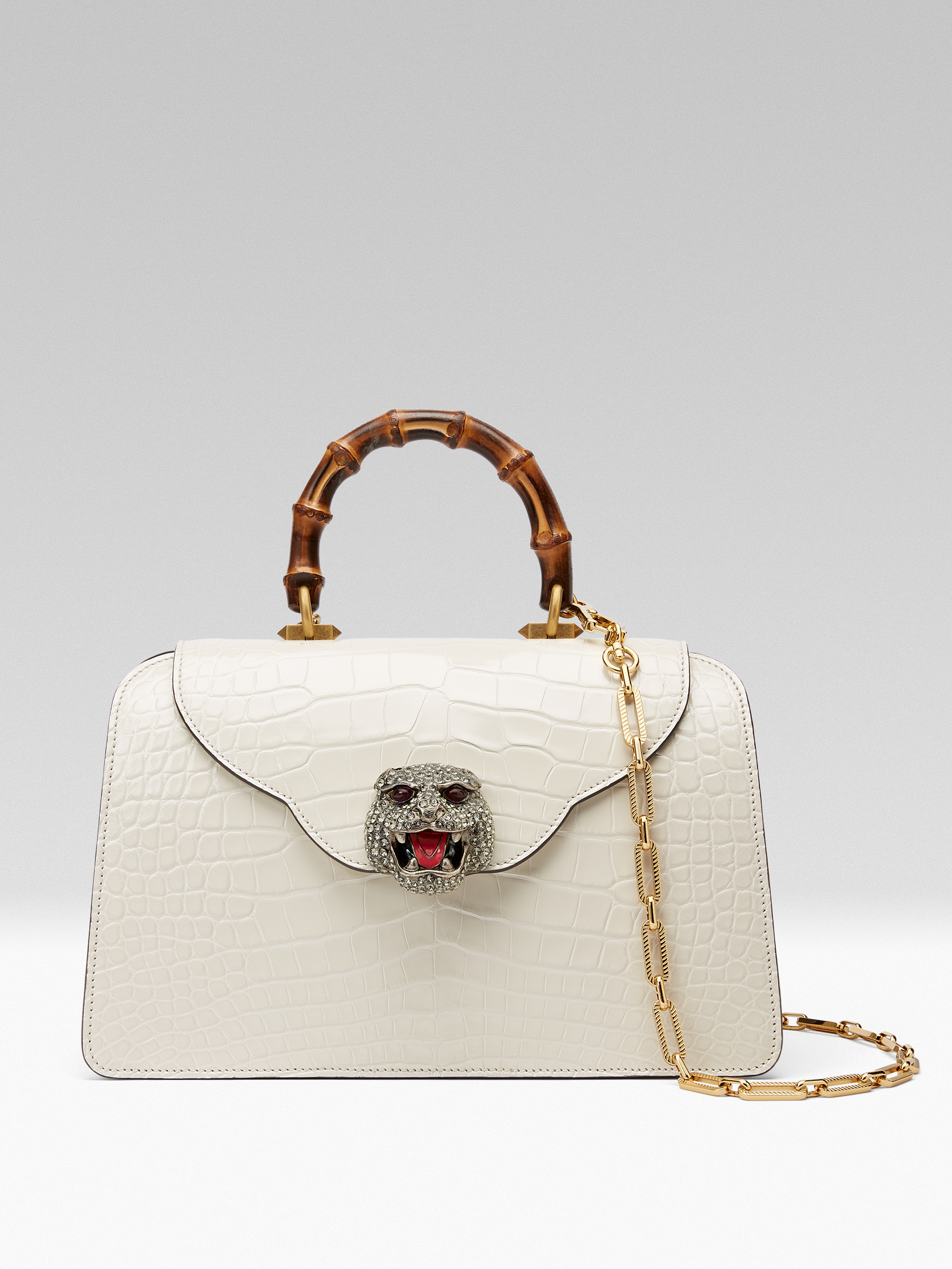 Gucci выпустили новую коллекцию сумок с бамбуковой ручкой Bamboo – в этом году модель отмечает 70-летний юбилей. Классическая сумка доступна в красном, белом и черном цветах. Gucci также использовали редкие материалы: кожу крокодила и страуса. Помимо классической модели в коллекцию вошли три новых сумки Bamboo: со съемными ремешками и цепочками, украшенные металлическими бабочками, тиграми и лисами и вставками из змеиной кожи. В подарок к каждой сумке идет книга Джейн Остин «Ювенилия» обложке с цветочным принтом.