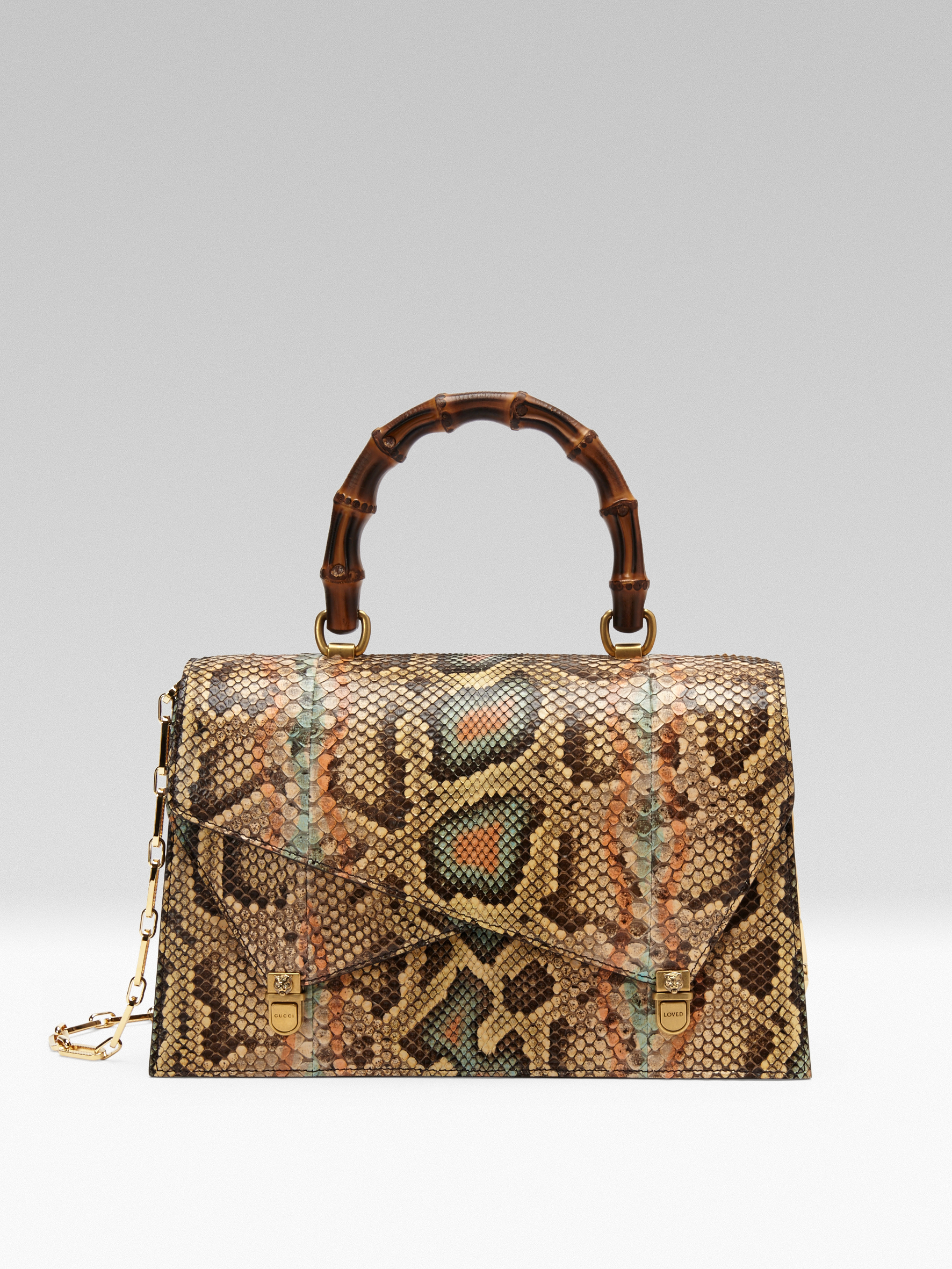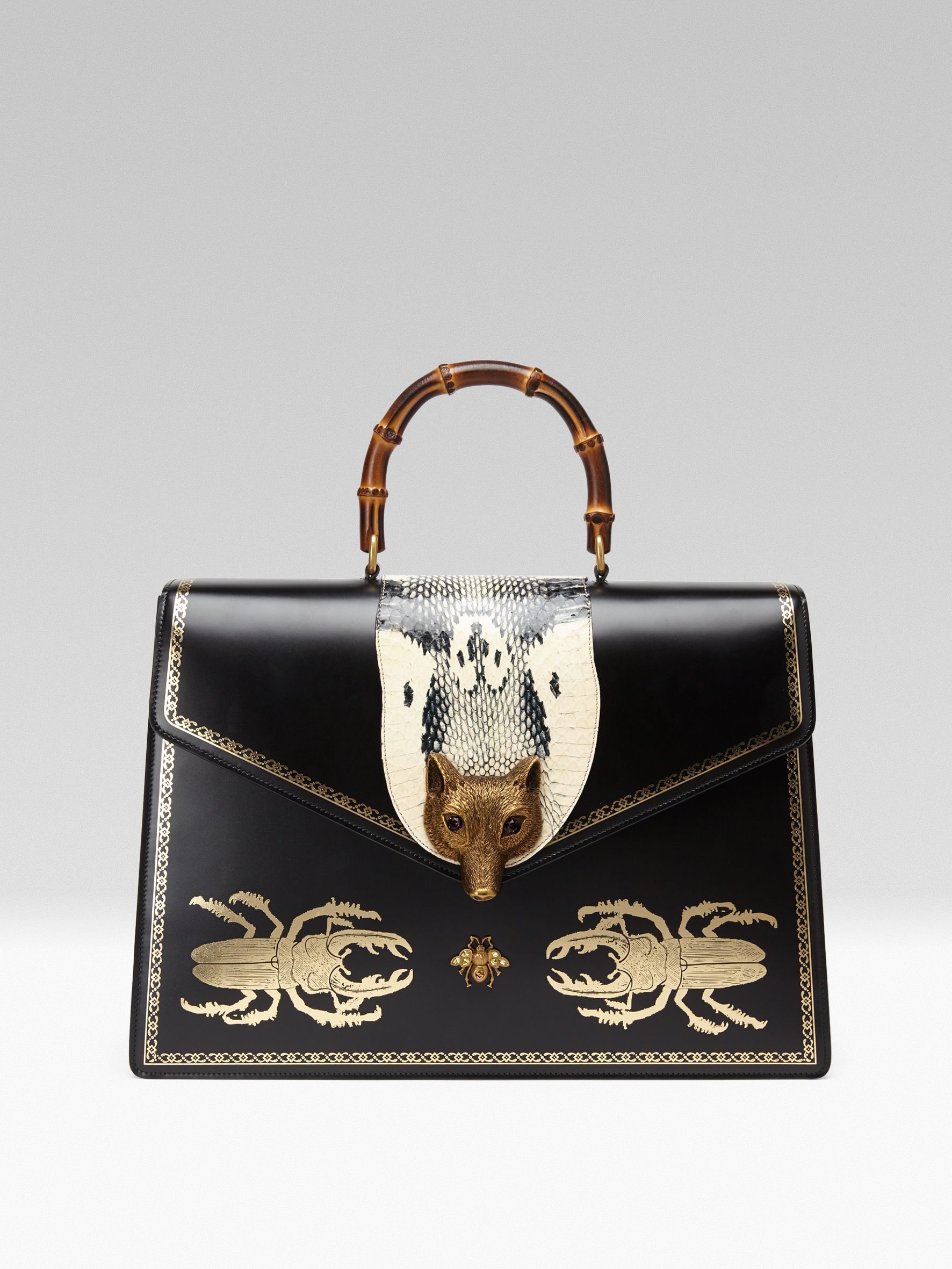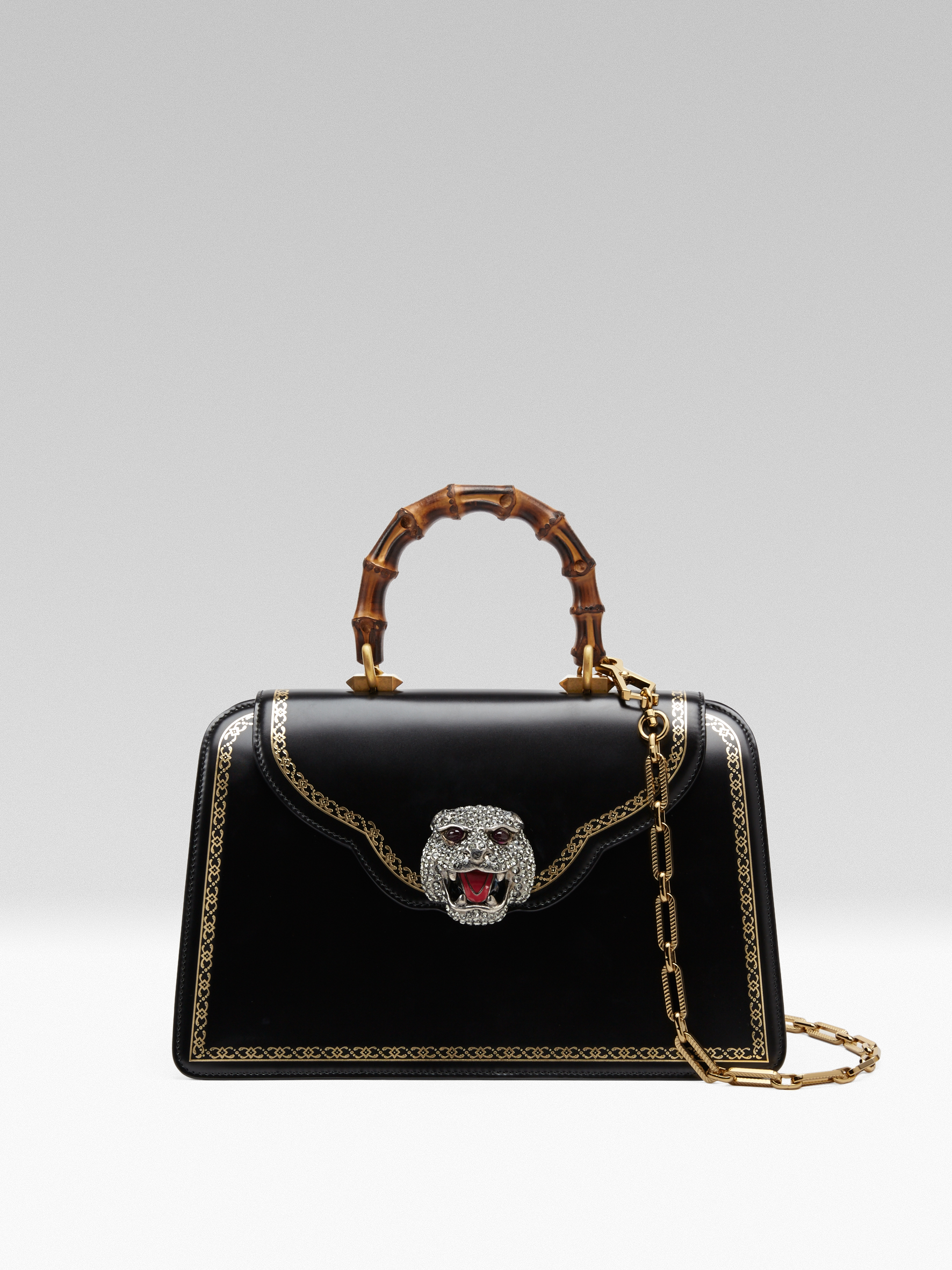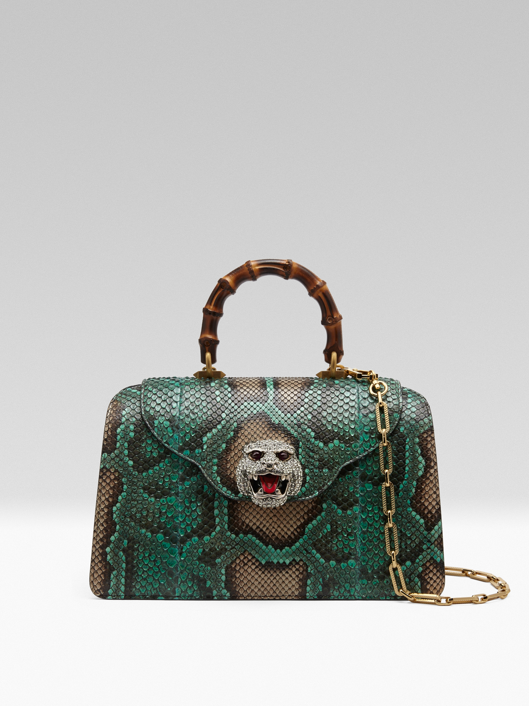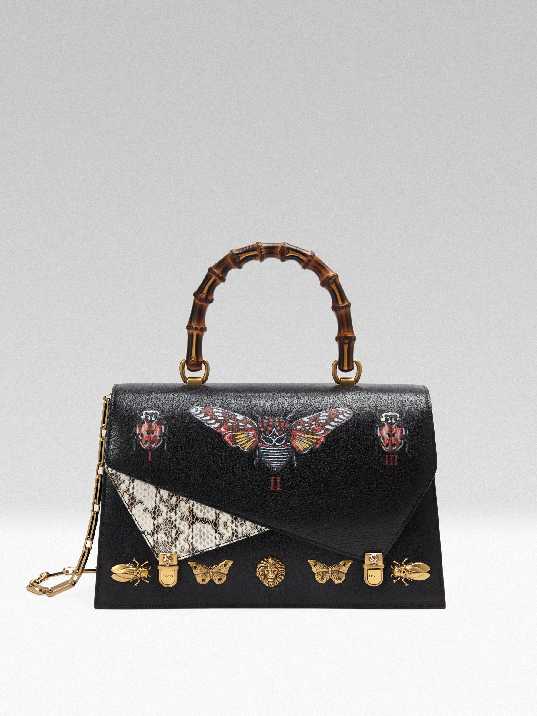Gucci выпустили новую коллекцию сумок с бамбуковой ручкой Bamboo – в этом году модель отмечает 70-летний юбилей. Классическая сумка доступна в красном, белом и черном цветах. Gucci также использовали редкие материалы: кожу крокодила и страуса. Помимо классической модели в коллекцию вошли три новых сумки Bamboo: со съемными ремешками и цепочками, украшенные металлическими бабочками, тиграми и лисами и вставками из змеиной кожи. В подарок к каждой сумке идет книга Джейн Остин «Ювенилия» обложке с цветочным принтом.