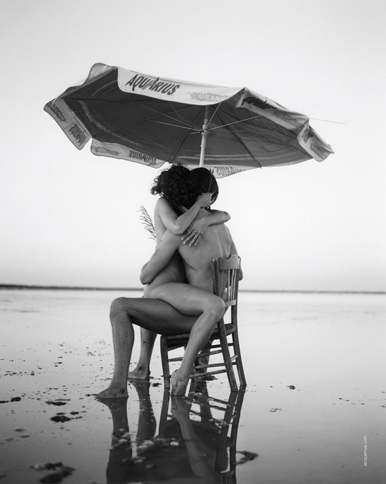 Jacquemus выпустили рекламную кампанию в поддержку осенне-зимней коллекции. На черно-белом снимке изображены голые мужчина и женщина: они сидят на стуле под пляжным зонтиком и целуются. Основатель бренда Симон Порт Жакмюс рассказал, что ему хотелось, чтобы в кадре не было ни одежды, ни аксессуаров — только влюбленная пара. Снимок сделал фотограф Давид Лураши. Он уже не раз сотрудничал с Жакмю. В качестве локации выбрали пляж на юге Франции.