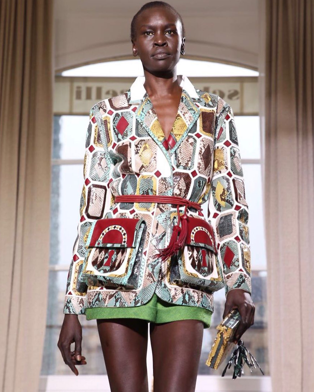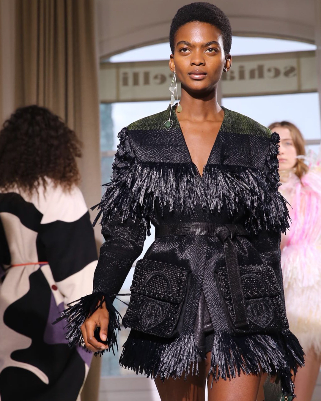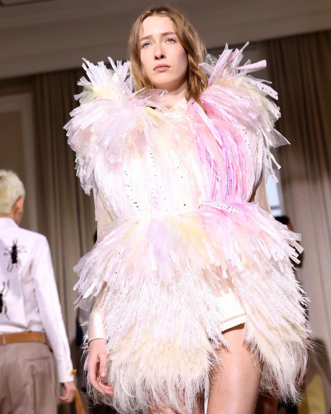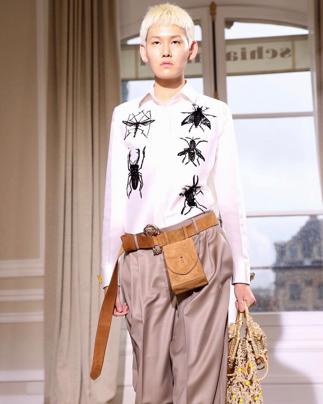 В Париже началась неделя высокой моды. Ее открыл показ Schiaparelli couture. В коллекции — много полупрозрачных тканей, а также жакет с имитацией техники кроше из кожи и гигантские вышитые насекомые на рубашке.
