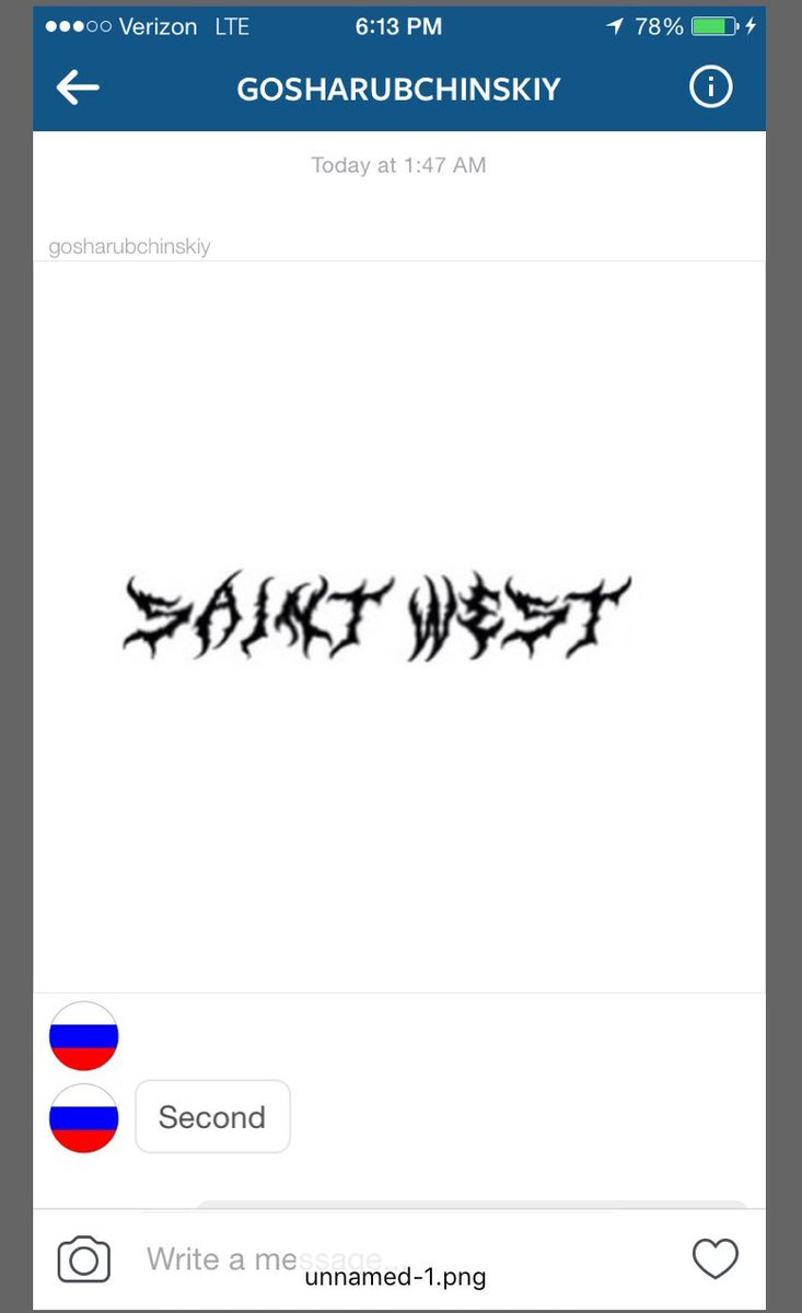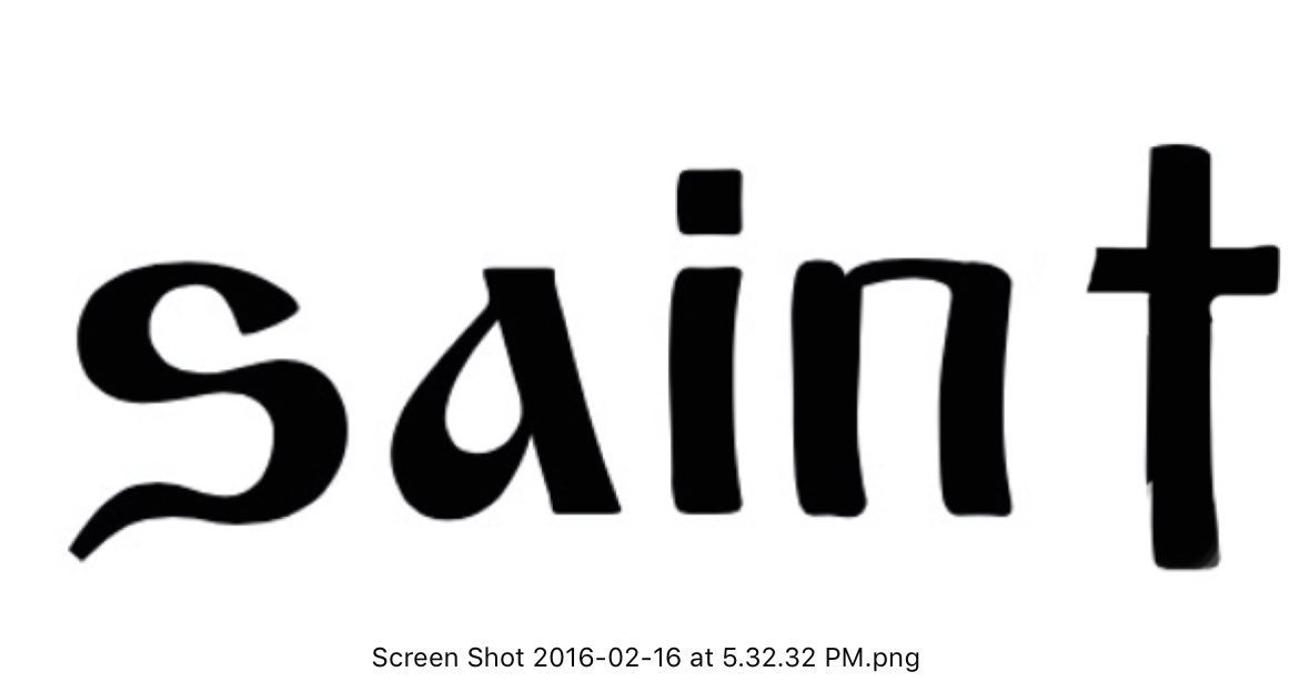 Канье Уэст показал в своем твиттере (он вернулся в соцсеть в пятницу) эскизы татуировки, которые для него сделал Гоша Рубчинский. Это стилизованное имя его сына Сэйнт Уэста, которое Канье хочет нанести себе на шею. Впрочем, Рубчинский не сам рисовал эскизы, а набрал надпись готовыми шрифтами – Art Dystopia и Izhitsa, во втором варианте только немного переделав букву t, для которой в этом шрифте нет прописного варианта.