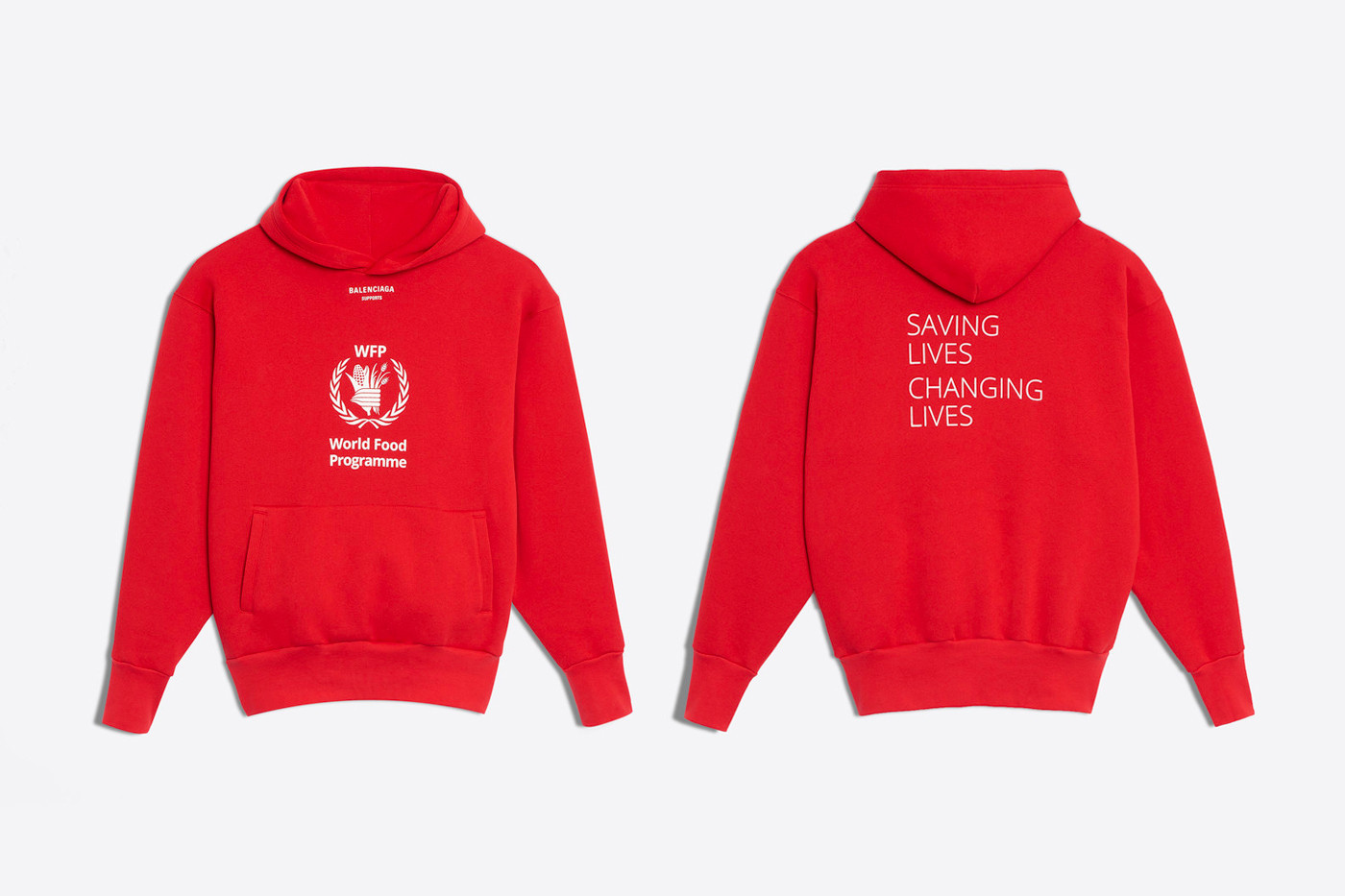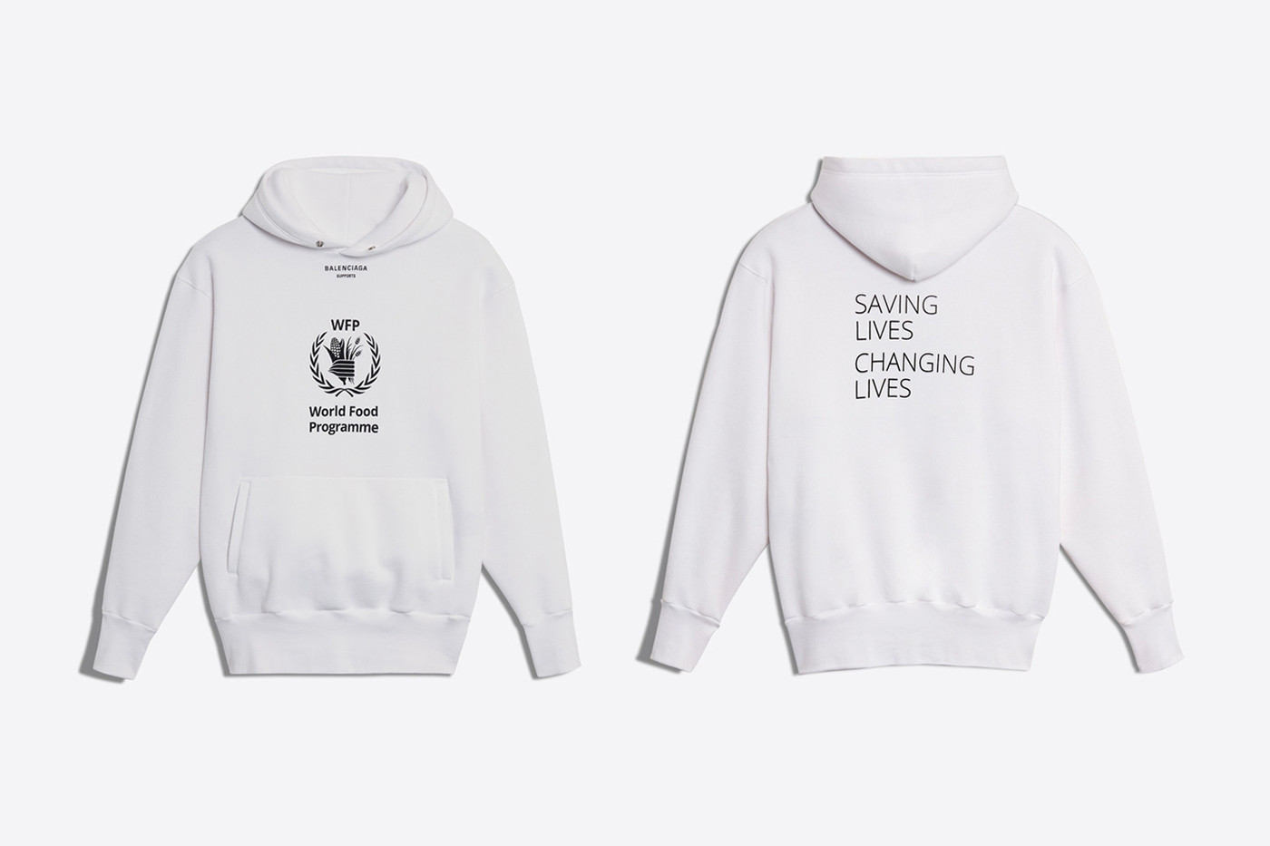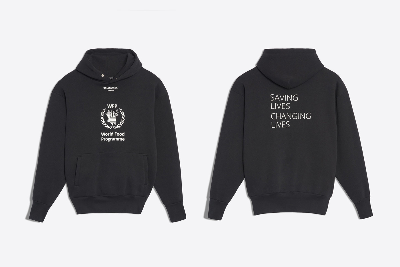 В марте Balenciaga подписали соглашение со Всемирной продовольственной программой (WFP) — гуманитарной организацией ООН, направленной на борьбу с голодом во всем мире. Теперь на сайте Balenciaga можно купить толстовки, футболки, ветровки, головные уборы, поясные сумки и шарфы с фразой «Saving lives changing lives» («Сохраняя жизни, изменяя жизни») и с логотипом World Food Programme. Планируется, что с 6 сентября по 1 февраля 2019 года Balenciaga пожертвуют организации 10% от цены каждого проданного фирменного предмета у себя на сайте и у ритейлеров-партнеров. Как сообщается на официальном сайте: «Balenciaga стремится привлечь внимание людей к важной проблеме глобального голода. Это партнерство — шаг к тому, чтобы сделать моду полезной».