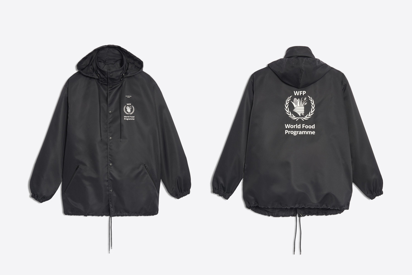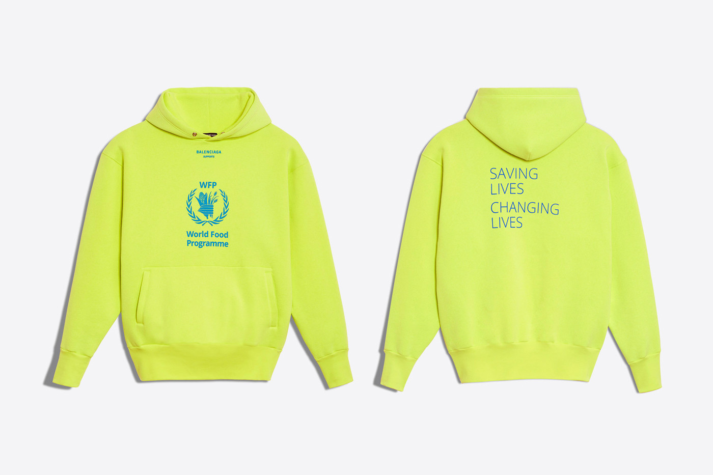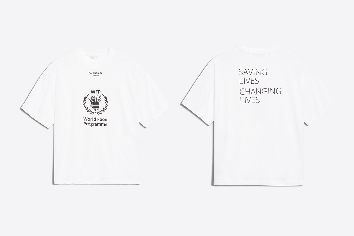 В марте Balenciaga подписали соглашение со Всемирной продовольственной программой (WFP) — гуманитарной организацией ООН, направленной на борьбу с голодом во всем мире. Теперь на сайте Balenciaga можно купить толстовки, футболки, ветровки, головные уборы, поясные сумки и шарфы с фразой «Saving lives changing lives» («Сохраняя жизни, изменяя жизни») и с логотипом World Food Programme. Планируется, что с 6 сентября по 1 февраля 2019 года Balenciaga пожертвуют организации 10% от цены каждого проданного фирменного предмета у себя на сайте и у ритейлеров-партнеров. Как сообщается на официальном сайте: «Balenciaga стремится привлечь внимание людей к важной проблеме глобального голода. Это партнерство — шаг к тому, чтобы сделать моду полезной».
