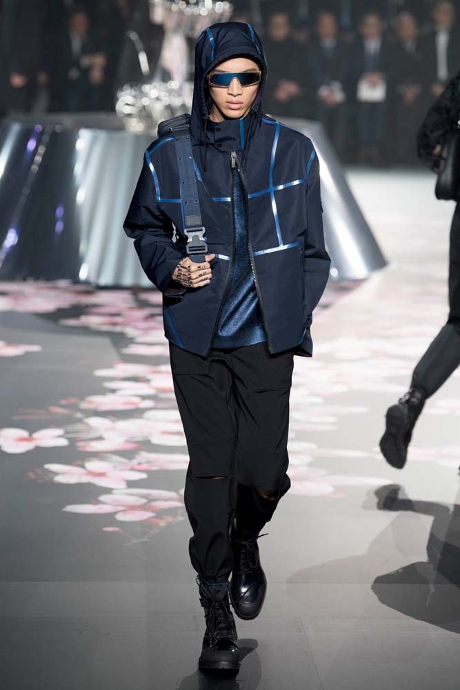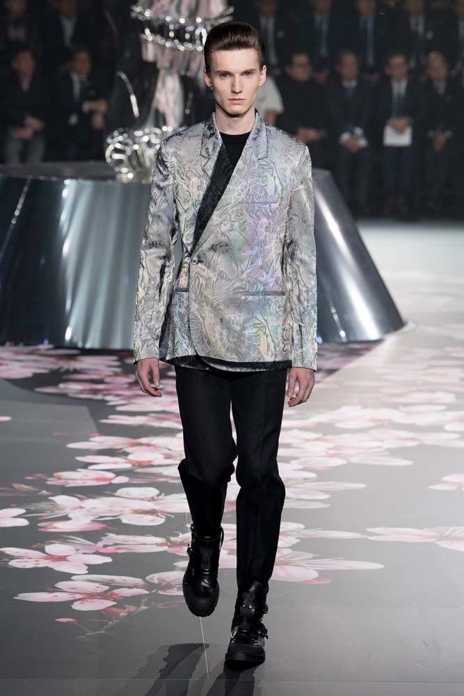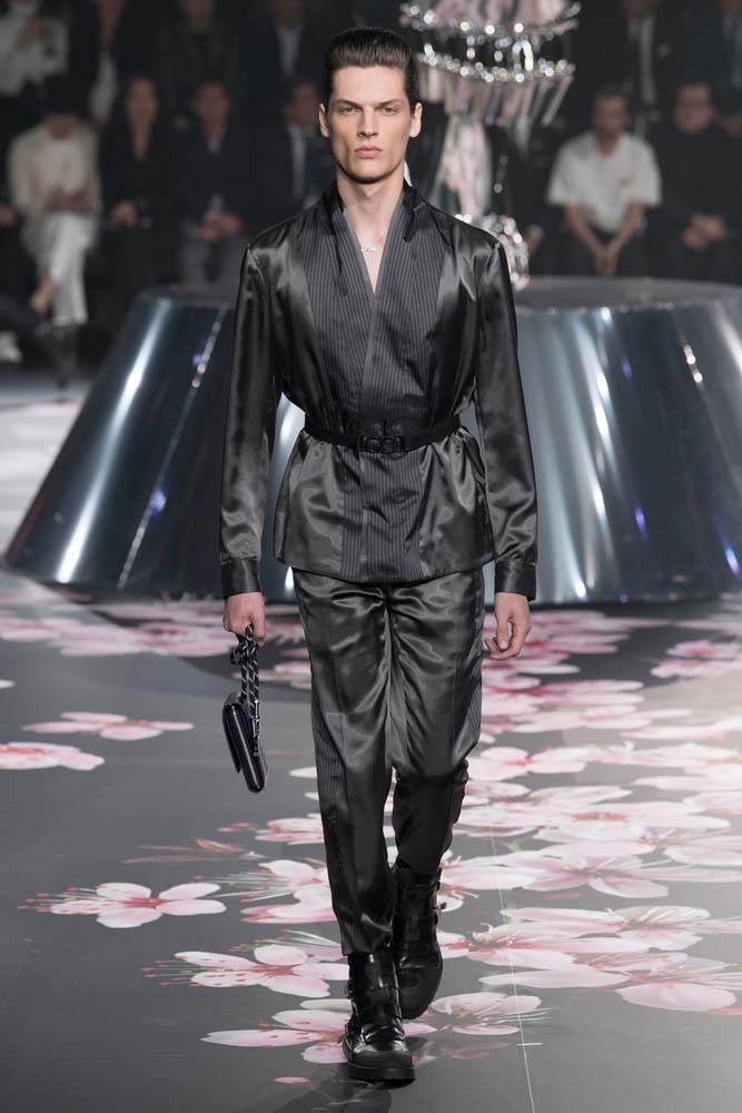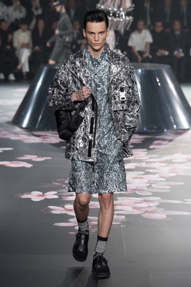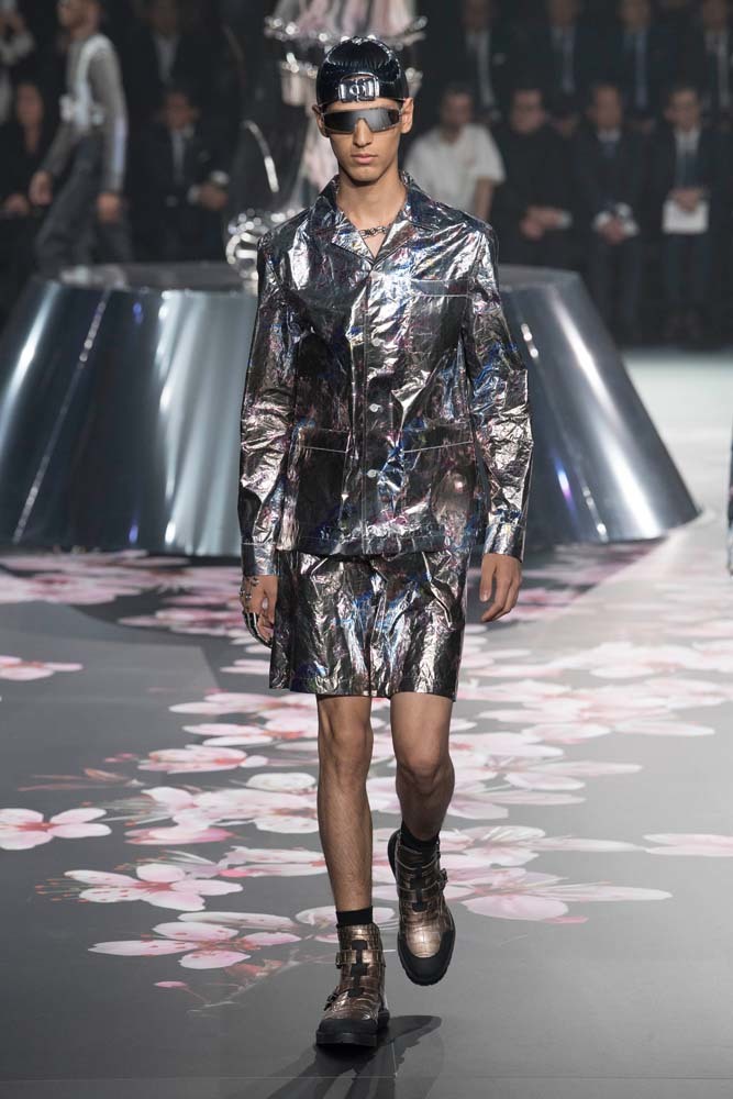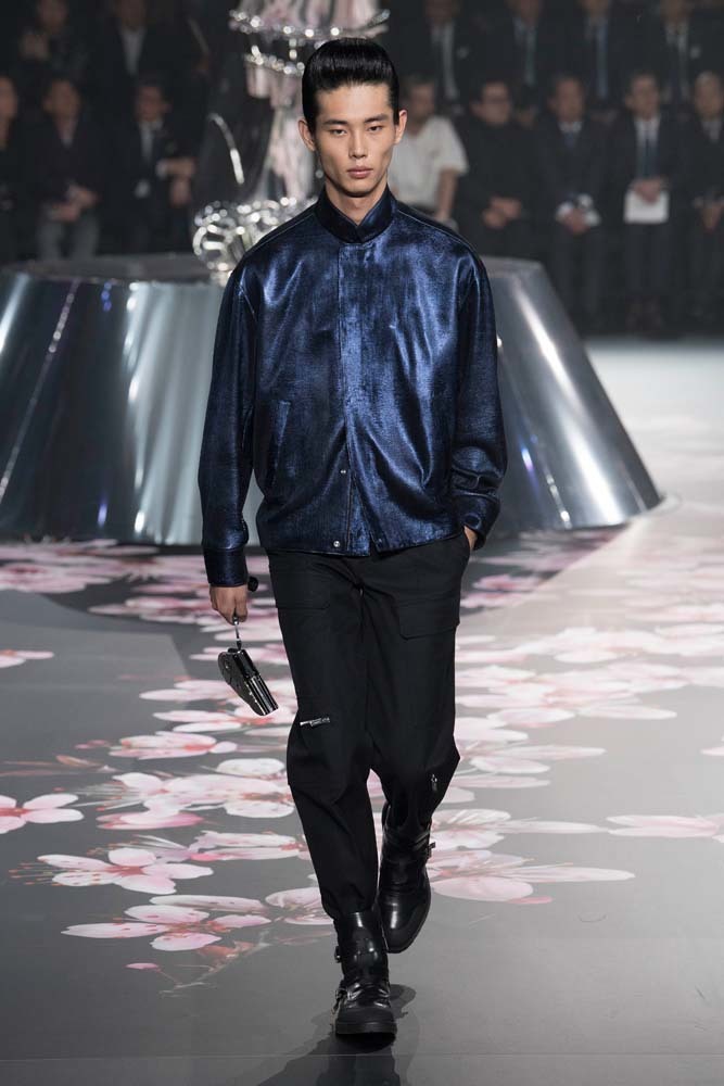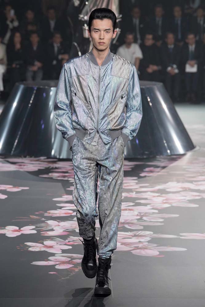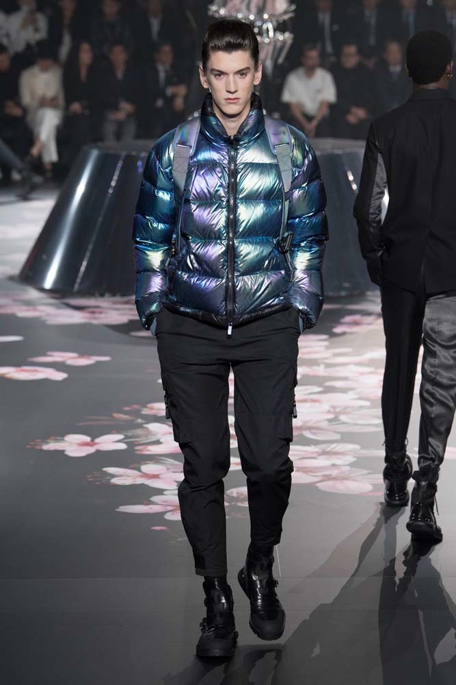 В Токио прошел показ мужской pre-fall-коллекции Dior. Креативный директор мужской линии бренда Ким Джонс позвал японского художника Хадзимэ Сораяму оформлять пространство: посреди подиума возвышалась 10-метровая футуристичная серебряная скульптура (в прошлый раз подиум тоже украшала огромная инсталляция). В одежде тоже было немало футуристичных элементов: светоотражающие линии, блестящие куртки, похожие на космические комбинезоны. А знаменитая модель седельной сумки предстала в виде маленького кошелька, подвешивающегося на ремень.