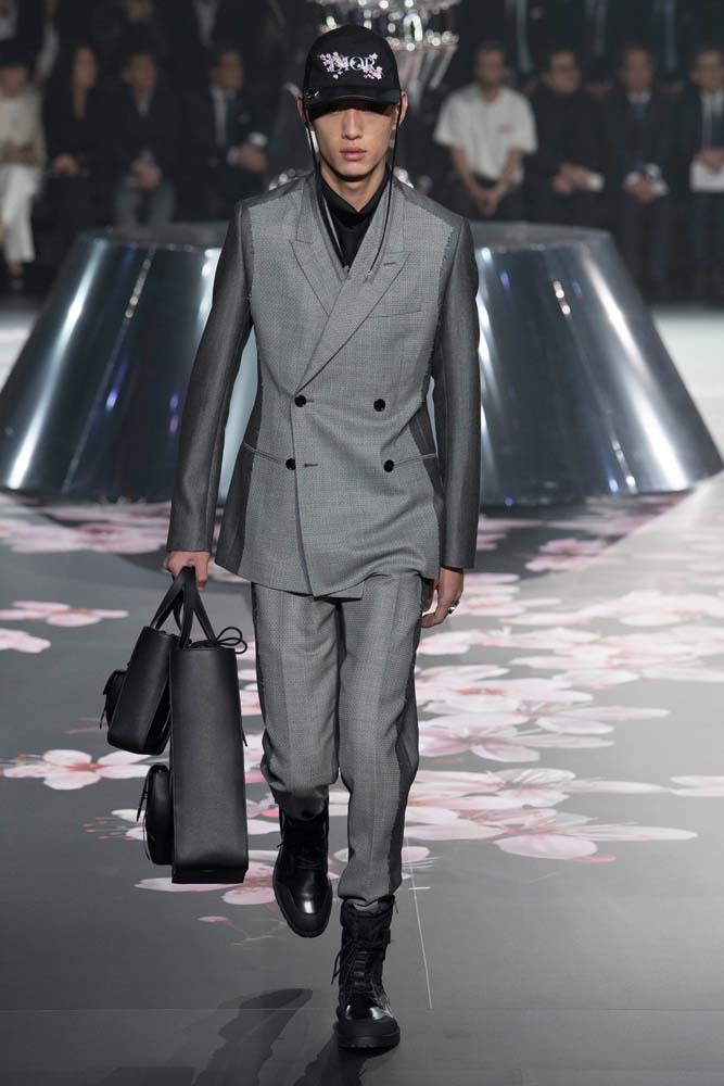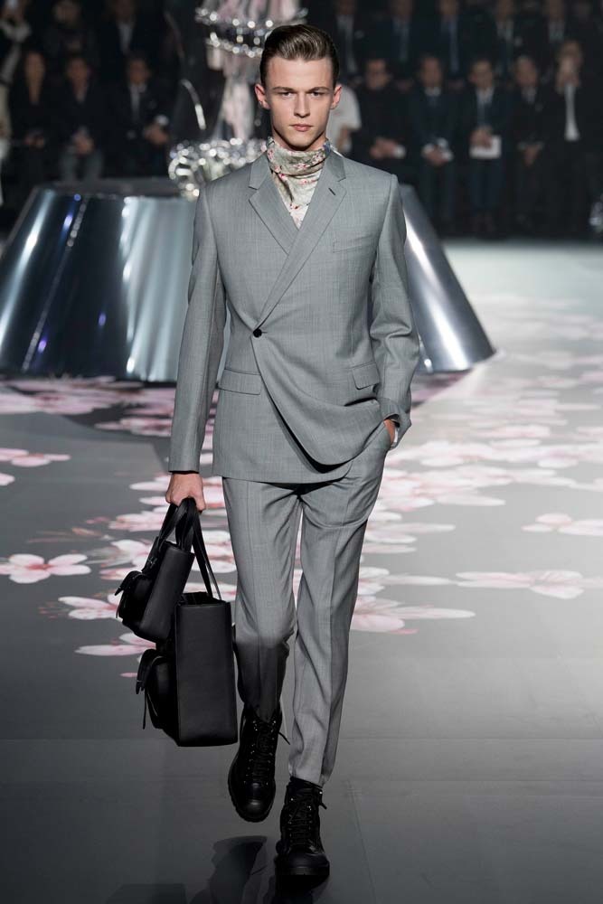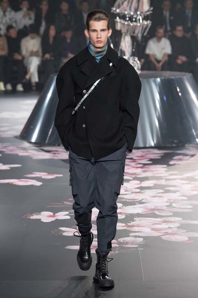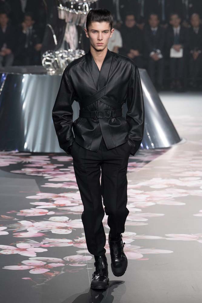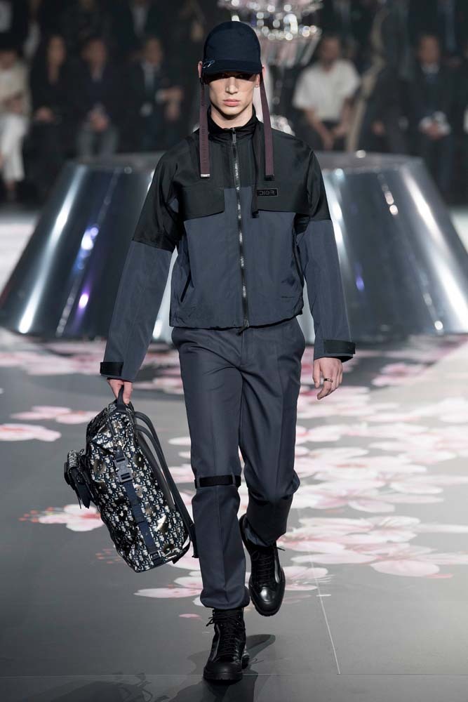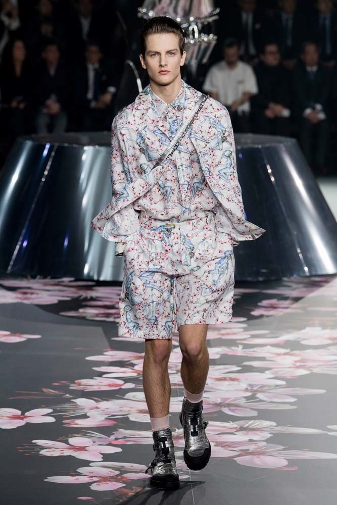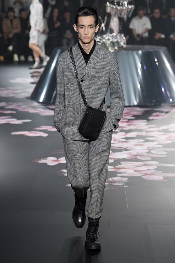 В Токио прошел показ мужской pre-fall-коллекции Dior. Креативный директор мужской линии бренда Ким Джонс позвал японского художника Хадзимэ Сораяму оформлять пространство: посреди подиума возвышалась 10-метровая футуристичная серебряная скульптура (в прошлый раз подиум тоже украшала огромная инсталляция). В одежде тоже было немало футуристичных элементов: светоотражающие линии, блестящие куртки, похожие на космические комбинезоны. А знаменитая модель седельной сумки предстала в виде маленького кошелька, подвешивающегося на ремень.
