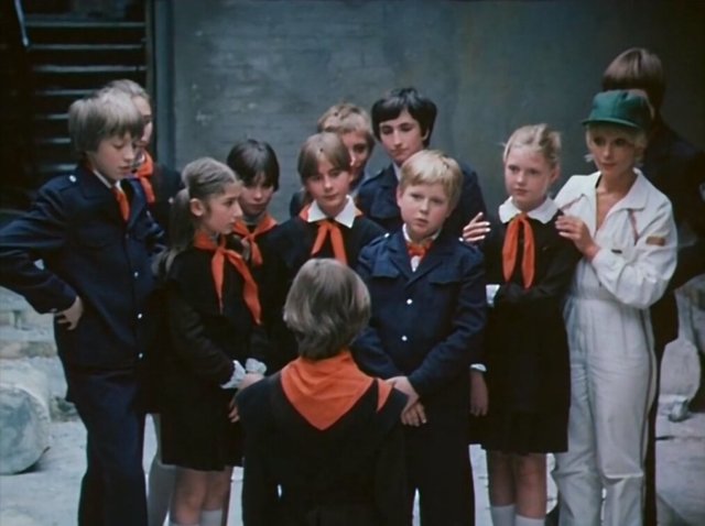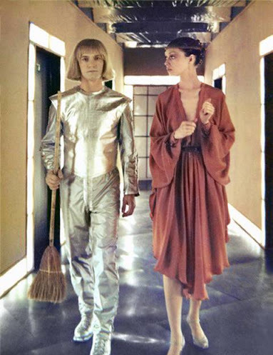 С формой советских школьников все сразу было понятно (кстати, именно в ней стилист Лотта Волкова открыла показ Vetements осень–зима 2016), а вот над костюмами взрослых, живущих в 2084 году, пришлось попотеть. «Очень хотелось шить костюмы из совершенно новых тканей, но ассортимент был весьма ограничен, — рассказывает Ольга Кравченя. — Приходилось использовать технические ткани, которые никогда не применялись для пошива одежды. Это всевозможные сетки, рогожа, искусственная кожа. Всегда выручали крепдешин, разные тюли, шифон». Тем не менее костюмерам удалось раздобыть какой-то секретный материал, который разрабатывался для космических полетов. Из него был сшит цельнолитой костюм без пуговиц и молний, в котором актер Евгений Герасимов изнывал от жары во время 12-часовых съемочных дней. Знал ли он, что прототипом для его образа стали киборги из итальянского фильма «Война роботов», неизвестно, но сходство соломенного каре и блестящего комбинезона неоспоримое.